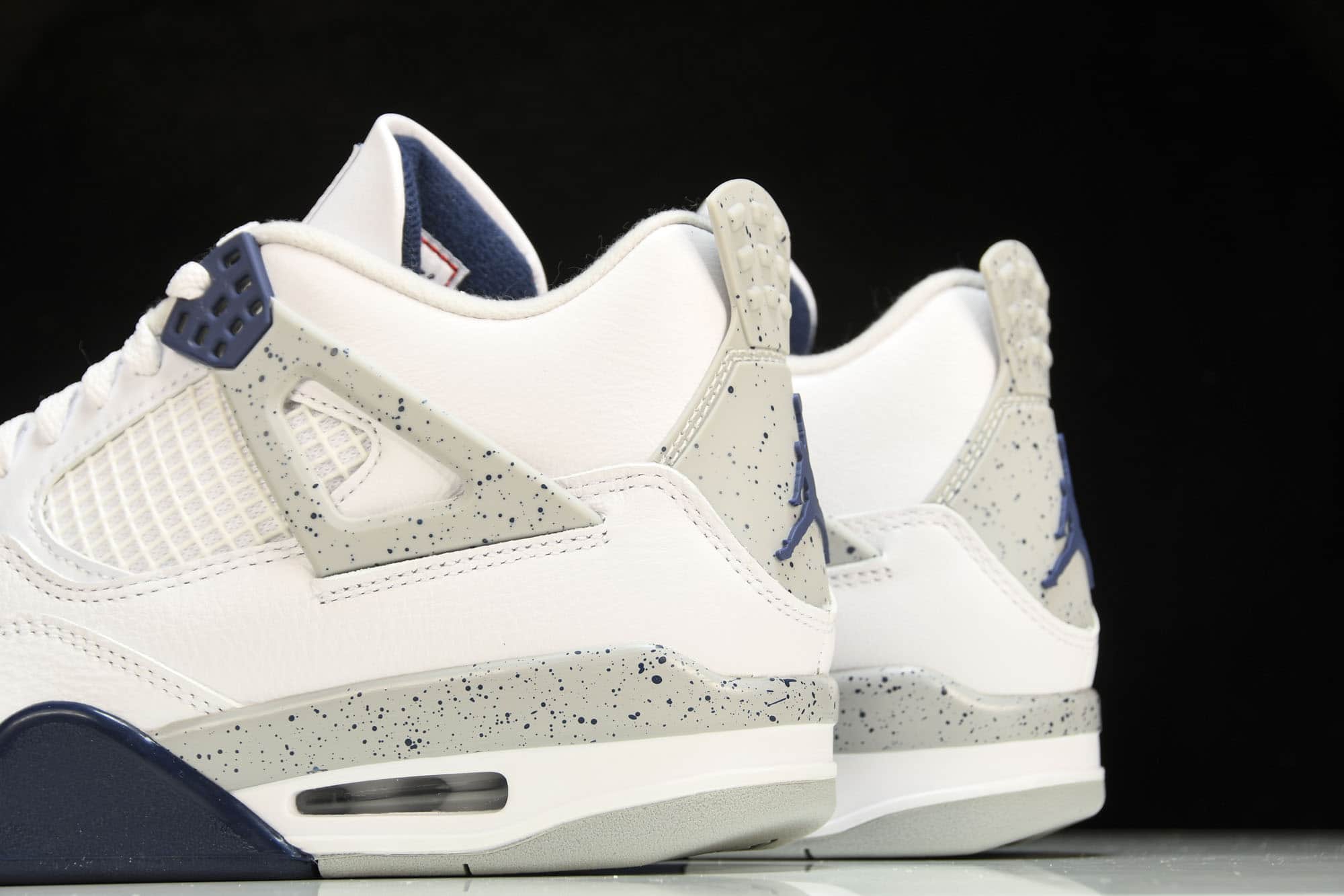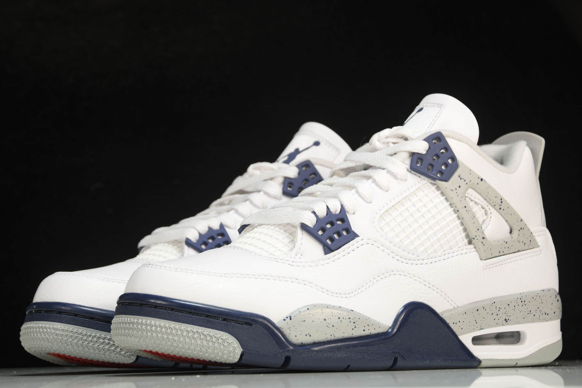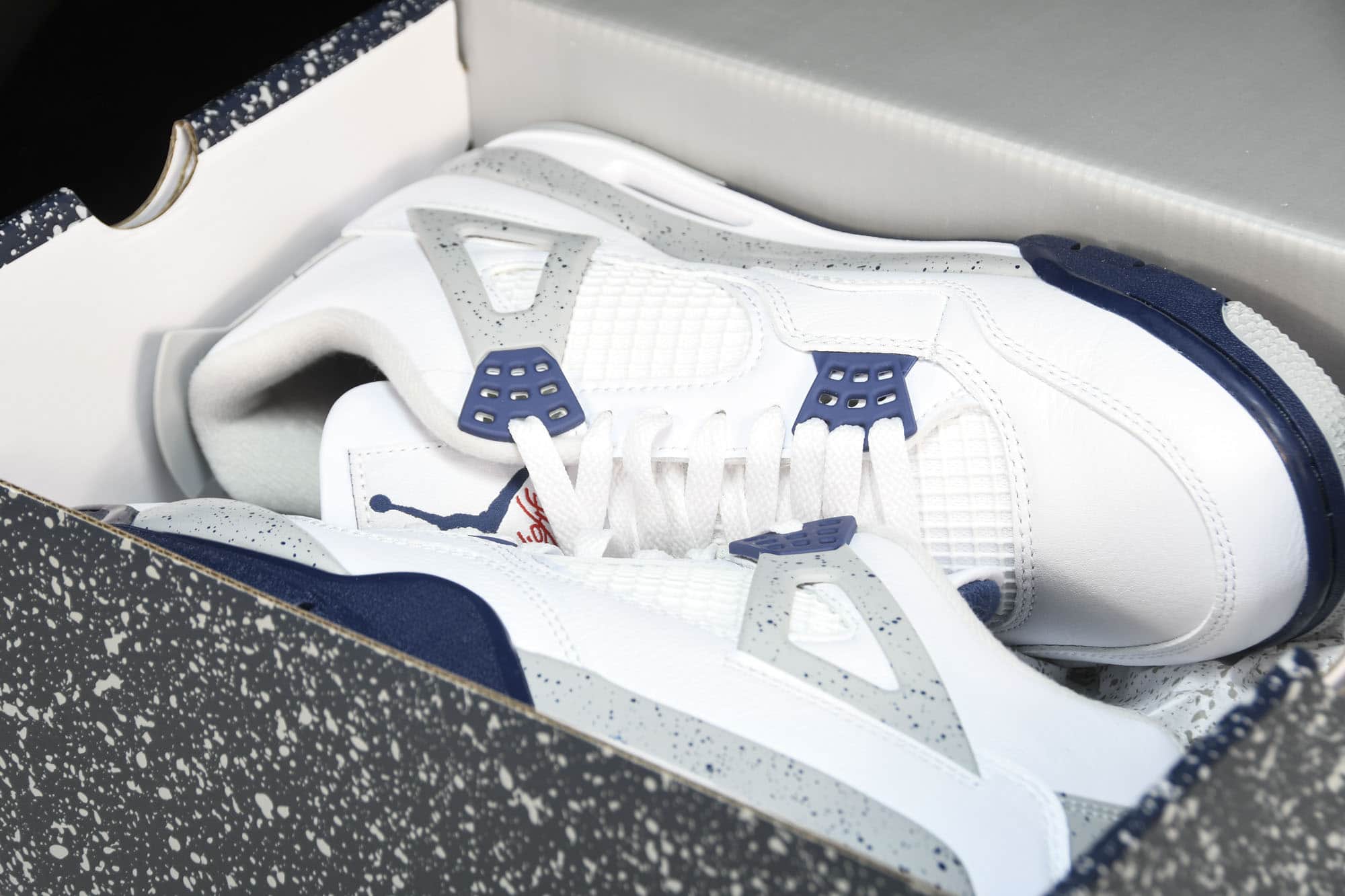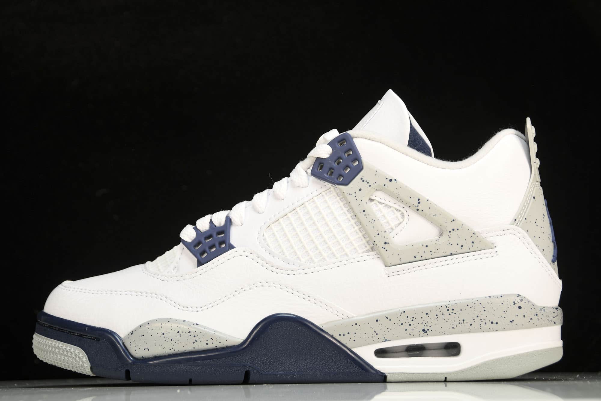 Модель Air Jordan 4 Retro "Midnight Navy" представляет собой унаследованный силуэт в той же цветовой гамме, что и модель OG "Fire Red". Верхняя часть выполнена из белой кожи с черными поддерживающими крыльями, соответствующим черным язычком на пятке с тисненым брендингом Jumpman и темно-синими литыми люверсами. Второй значок Jumpman украшает тканый язычок малинового цвета. Кроссовки опираются на двухцветную полиуретановую промежуточную подошву, в носочной части которой заключен баллон Air, а в пяточной - видимый блок.- Цвета: White/Midnight Navy/Light Smoke Grey/Fire Red