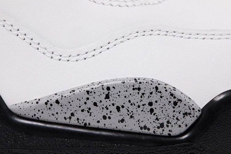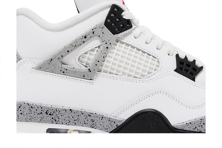 Модель 2025 года Air Jordan 4 Retro OG "White Cement" имеет многослойный верх из белой кожи с сеткой на четверти и черными литыми люверсами. Акценты Tech Grey, покрытые черными крапинками, расставлены на крыльях поддержки TPU, полиуретановой подошве с воздушной поддержкой и пяточном язычке, на котором красуется брендинг Nike Air. Яркая вспышка цвета - малиновый логотип Jumpman на язычке Flight. Под ногами резиновая подошва с гибкими канавками и рисунком сцепления "елочка".