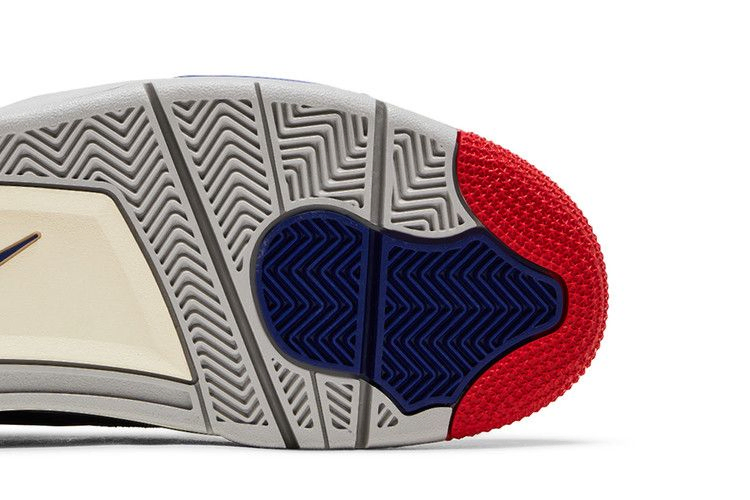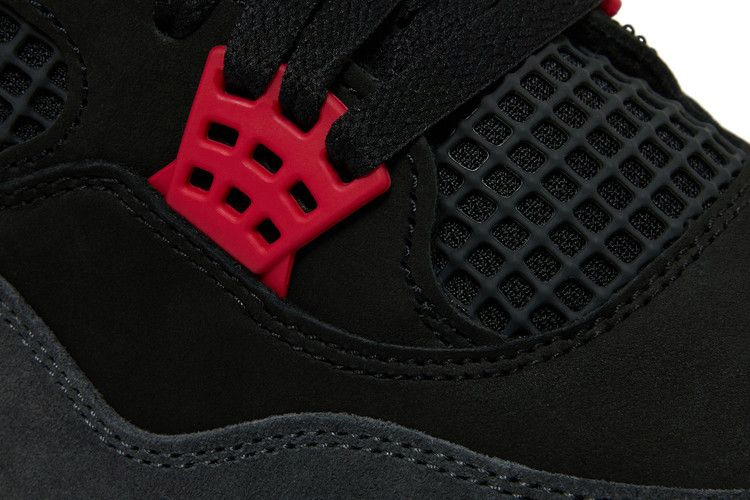 Модель Air Jordan 4 Retro "Rare Air - Gold Lettering" выполнена из черного нубука с замшевой накладкой на носочной части темно-серого цвета. В дополнение к малиновым люверсам TPU, контрастные цвета добавляются через подкладку воротника королевского синего цвета и вставку на пятке, украшенную рельефным брендингом Nike Air. На язычке можно снять липучку с надписью "Jordan Rare Air", выполненной золотыми буквами.