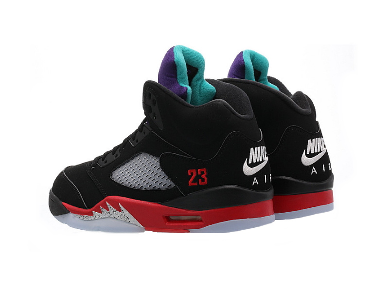Верх из нубука выполнен в цветовой гамме Black / Metallic Silver, дополнен кружевными замками и логотипом Nike Air на пятке. Вышитая цифра 23 взята из цветовой гаммы Fire Red, красная мидсоль смешана с металлическими серебряными деталями в виде акульих зубов.- Цвета: Black/Fire Red/Grape Ice/New Emerald