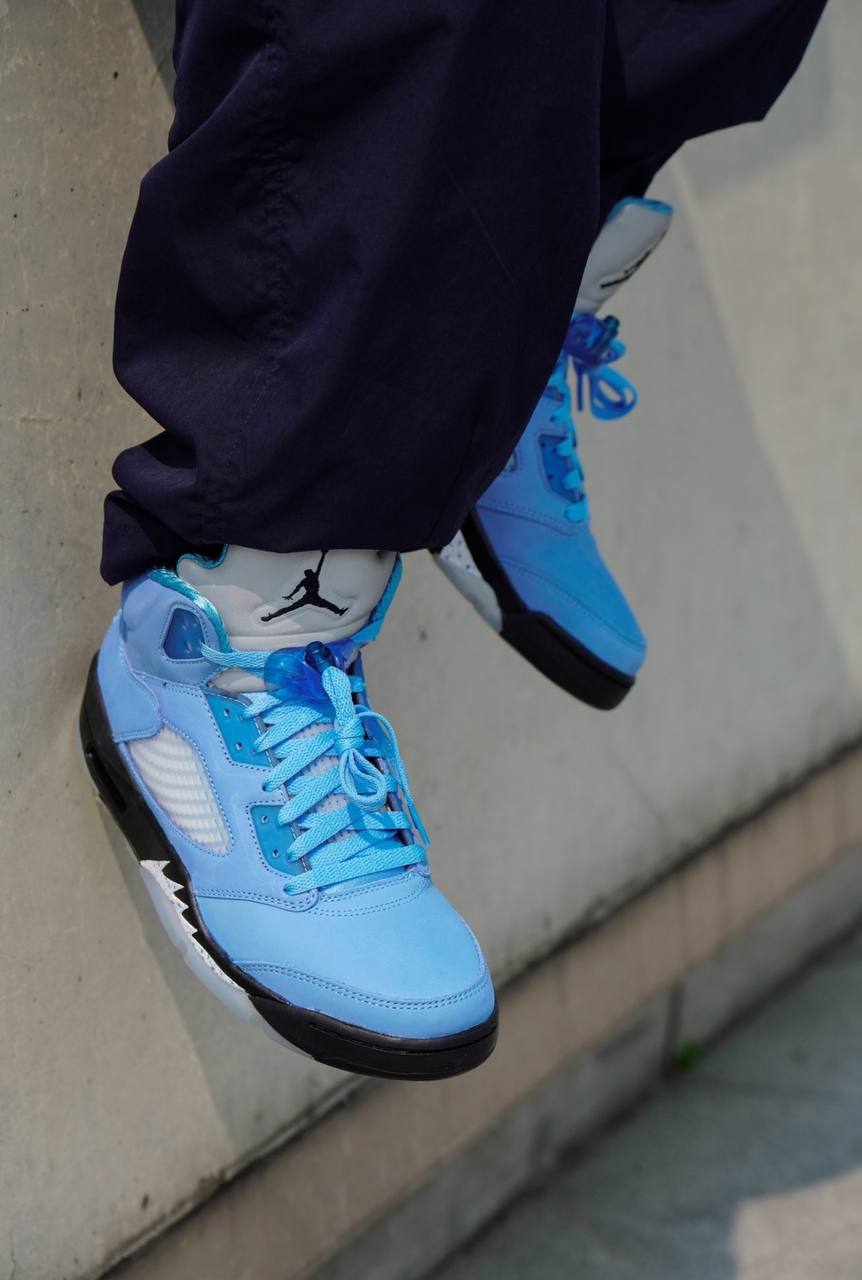 Модель Air Jordan 5 Retro 'UNC' имеет знакомый пастельный оттенок, вдохновленный альма-матер Майкла Джордана. Верх выполнен из нубука цвета University Blue с тональными люверсами TPU, вентилируемой сеткой на четверти панели и тканой биркой на пятке. Язычок украшен вышитым Jumpman, а для лучшей видимости в условиях недостаточной освещенности на нем нанесено светоотражающее серебристое покрытие. Легкая амортизация обеспечивается черной полиуретановой промежуточной подошвой, украшенной крапчатыми деталями в виде акульих зубов и оснащенной видимым блоком Air-sole в пятке. Под ногами полупрозрачная подошва с елочным рисунком обеспечивает оптимальное сцепление.- Цвета: University Blue/Black/White