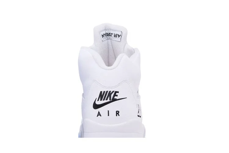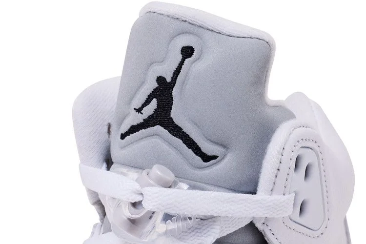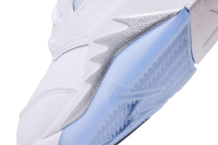 Модель Air Jordan 5 Retro «White Metallic» 2026 года возрождает нестандартную цветовую гамму модели, разработанной Тинкером Хэтфилдом. Эта пара соответствует оригинальному выпуску 2000 года: верх из белой кожи с формованными в тон проушинами и полупрозрачной сеткой на боковых панелях. Помимо вышитой цифры «23» на боковой пятке, элементы брендинга включают значок Jumpman на серебристом светоотражающем язычке и надпись «Nike Air» на задней пятке. Металлизированный серебристый зуб акулы украшает белую полиуретановую межподошву, дополненную вставкой Air-Sole в области пятки и усиленной полупрозрачной резиновой подошвой.