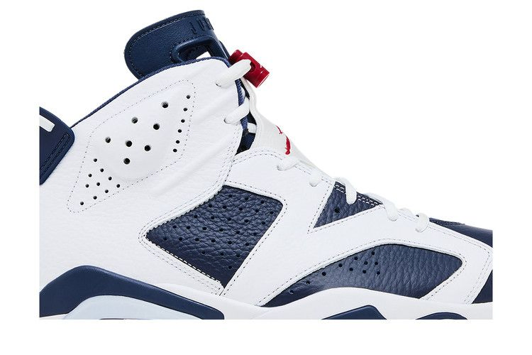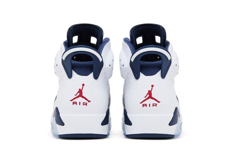 Модель 2024 года Air Jordan 6 Retro "Olympic" возвращается к расцветке, которая первоначально была выпущена в 2000 году во время летних Олимпийских игр в Сиднее, Австралия. Верхняя часть кроссовок выполнена из кожи цвета Midnight Navy с контрастными белыми накладками. Вышитые логотипы Jumpman Varsity Red расположены на защите шнурков и задней части пятки. К деталям наследия относятся формованный язычок с двумя отверстиями, замки для шнурков и застежка в виде спойлера. Легкая амортизация обеспечивается полиуретановой промежуточной подошвой с видимым блоком Air-sole в пятке и полупрозрачной резиновой подошвой.