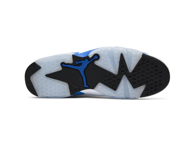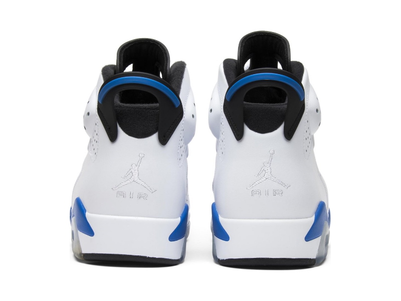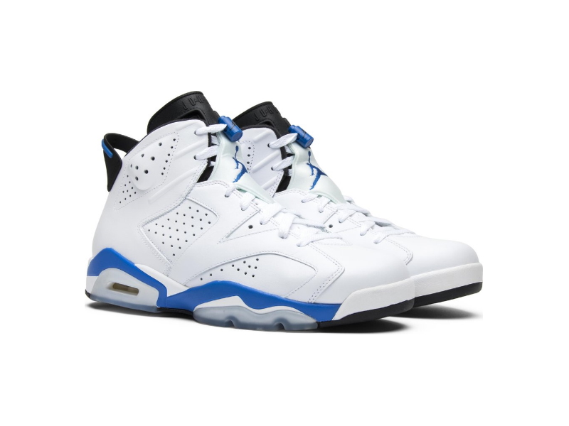 Выпущенные в 1991 году как одна из пяти оригинальных расцветок, Air Jordan 6 «Sport Blue» (также известный как «сентябрьский синий») не увидели своего первого выпуска в ретро-стиле до 2014 года. Кроссовки имеют полностью белый верх из гладкой перфорированной кожи с логотипом Air Jumpman на фирменном резиновом язычке и кружевной накладке, а также на пятке.- Цвета: White/Sport Blue-Black