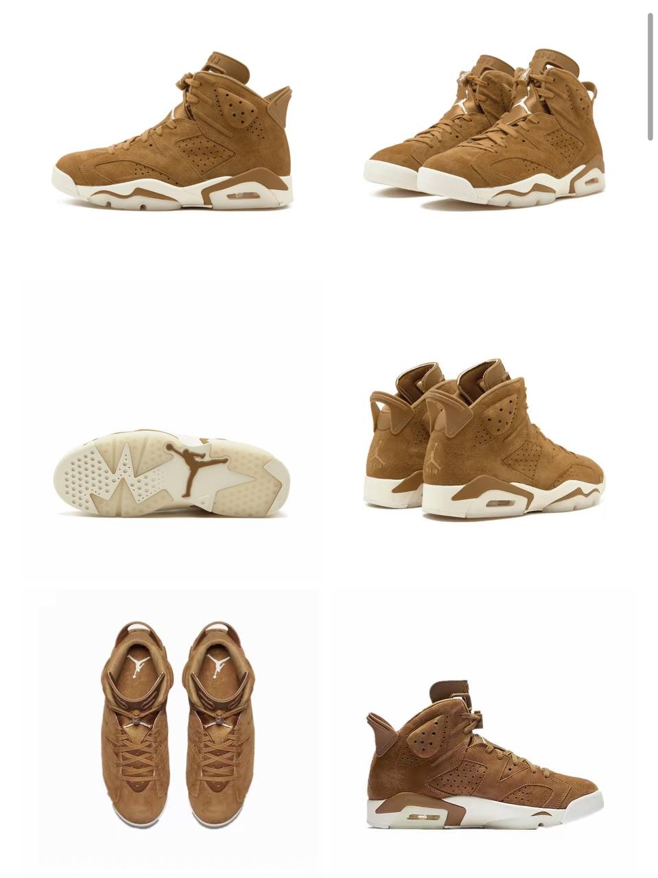 Модель Air Jordan 6 Retro «Wheat», выпущенная в ноябре 2017 года, стала продолжением ограниченной серии PSNY x Air Jordan 12. Цветовая гамма включает полностью замшевый верх Golden Harvest премиум-класса с неопреновым язычком, шнурками в тон и перфорированными деталями. Обувь также поставляется с логотипом Sail Jumpman, межподошвой и полупрозрачной резиновой подошвой.