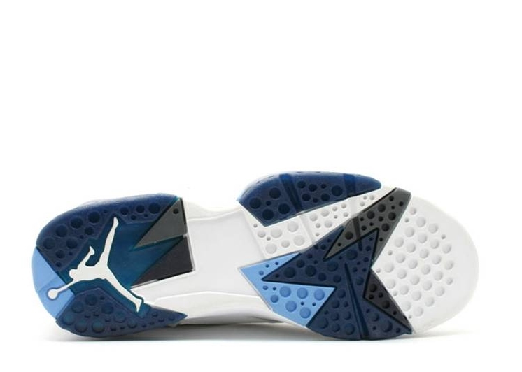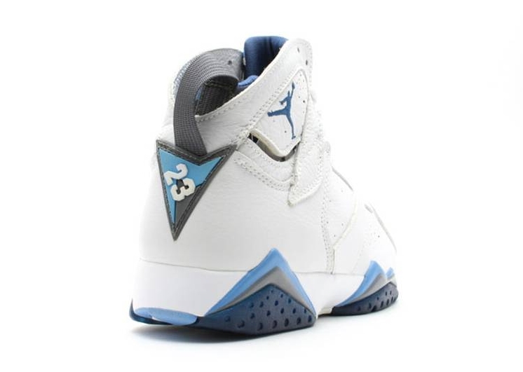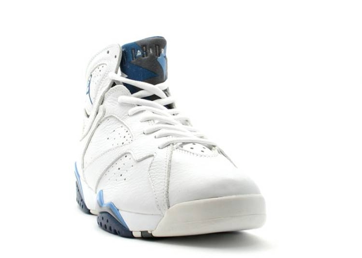 Модель Air Jordan 7 Retro «French Blue» 2002 года отличается простой цветовой гаммой, напоминающей различные стили OG, выпущенные 10 годами ранее. По всему верху используется белая кожа. Мидсоль лишена видимой вставки Air Sole из предыдущих моделей и добавляет неровные детали, отделанные контрастными вставками французского синего и университетского синего цветов.- Цвета: White/French Blue-Flint Grey