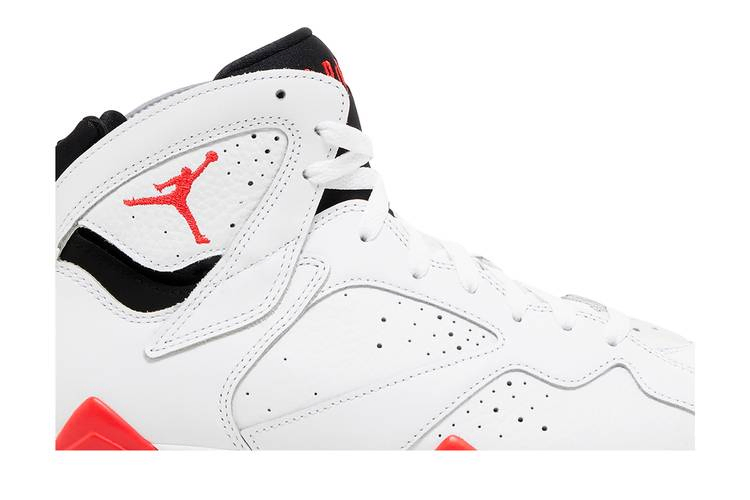 Модель Air Jordan 7 Retro "White Infrared" выполнена в знакомой цветовой гамме OG, которая впервые появилась на Air Jordan 6. Многослойный верх выполнен из белой кожи с перфорацией по всей носочной части и воротнику. Последний отмечен инфракрасным логотипом Jumpman на боковой стороне, совпадающим с надписью 'Air Jordan', украшающей эластичный неопреновый язычок. Пятка украшена литой нашивкой "23", а на носочной части красуется классический логотип Nike Air. Легкая амортизация обеспечивается белой полиуретановой подошвой, украшенной инфракрасными деталями и усиленной полупрозрачной резиновой подошвой.