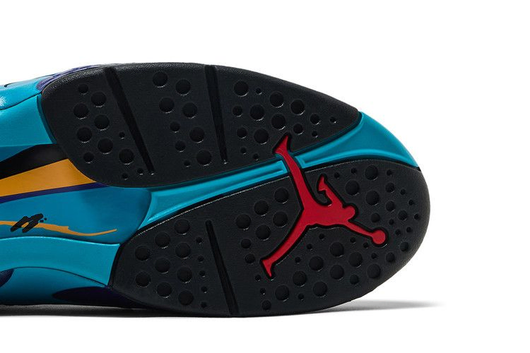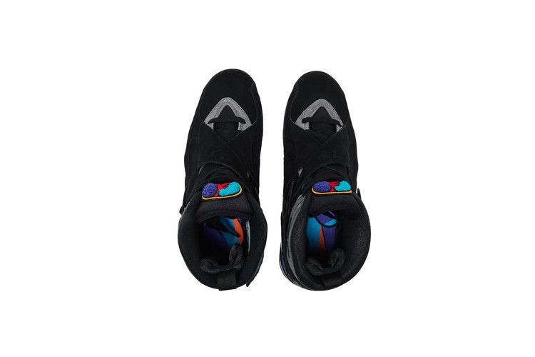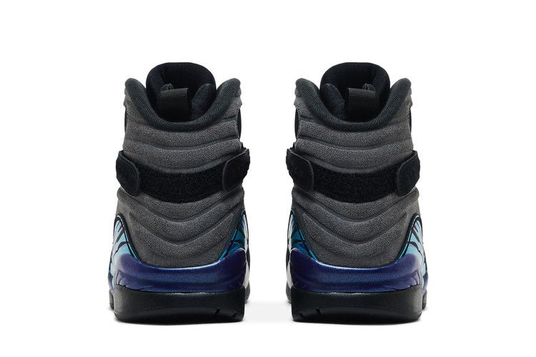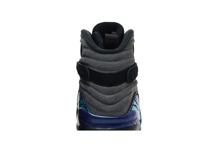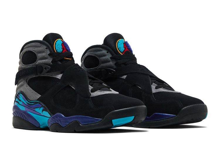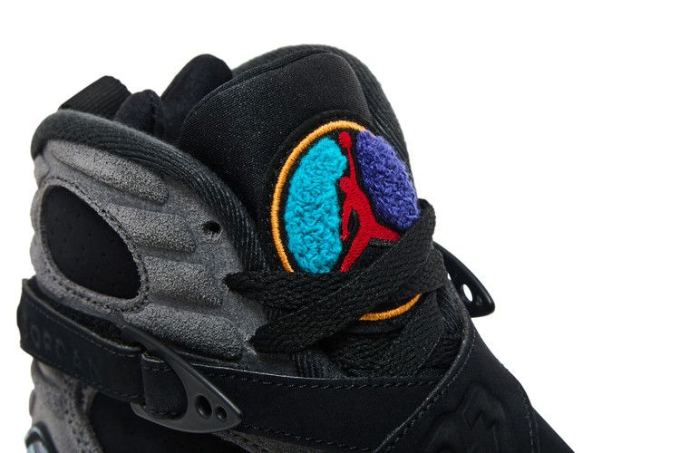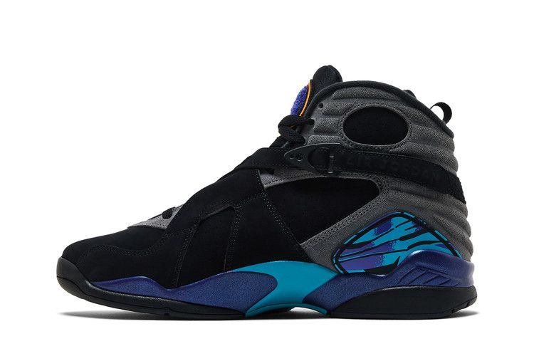 Выпуск 2025 года Air Jordan 8 Retro 'Aqua' возвращает одну из трех расцветок AJ8. В соответствии с оригинальным выпуском 1993 года, это переиздание имеет черно-серый нубуковый верх с уникальной конструкцией перекрестных ремешков. Нейтральная отделка контрастирует с многоцветным синельным язычком, отмеченным малиновым логотипом Jumpman, и панелью поддержки тилового цвета с фиолетовыми мазками.