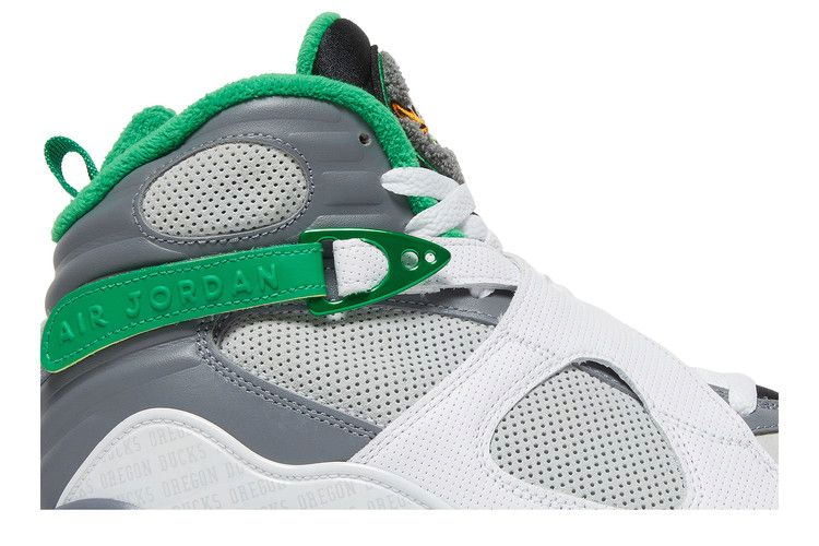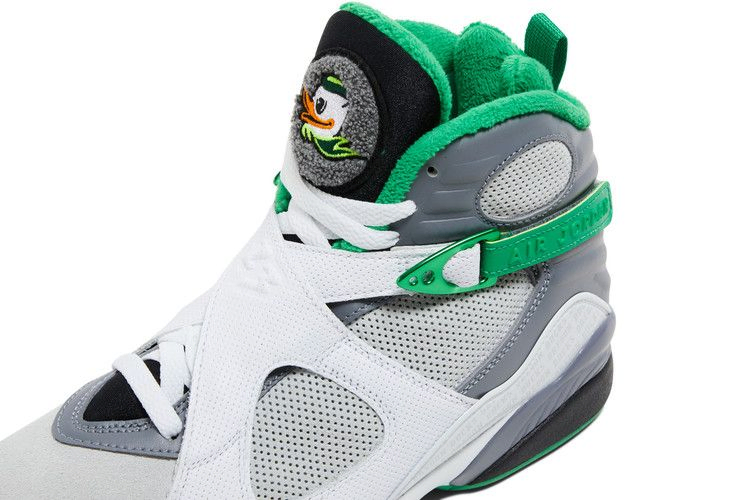 Эксклюзивные кроссовки Air Jordan 8 "University of Oregon - Pure Platinum", разработанные Тинкером Хэтфилдом для спортсменов из Орегона, имеют белые кожаные перекрестные ремни и контрастную пятку Cool Grey. Логотип Oregon Ducks изображен на синельном язычке. Дополнительный логотип Oregon Ducks можно увидеть на светоотражающей стойке пятки.