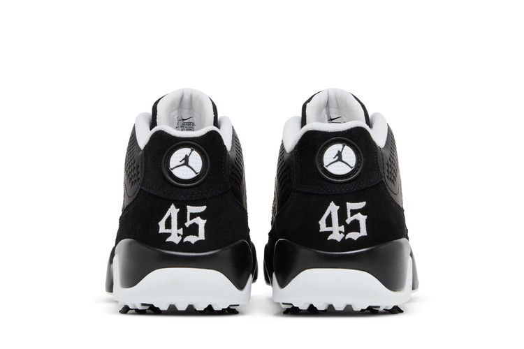 Модель Air Jordan 9 Low Golf "Barons" вдохновлена короткой бейсбольной карьерой Майкла Джордана в команде Birmingham Barons. Система быстрой шнуровки фиксирует водонепроницаемый верх из черной кожи, дополненный замшей в тон на брызговике и накладке на пятке. На стельке из пеноматериала с эффектом памяти красуется вышивка "45". Черная межподошва с вкраплениями Air-sole обеспечивает легкую амортизацию. Подошва оснащена семью съемными шипами Champs для оптимального сцепления с поверхностью.