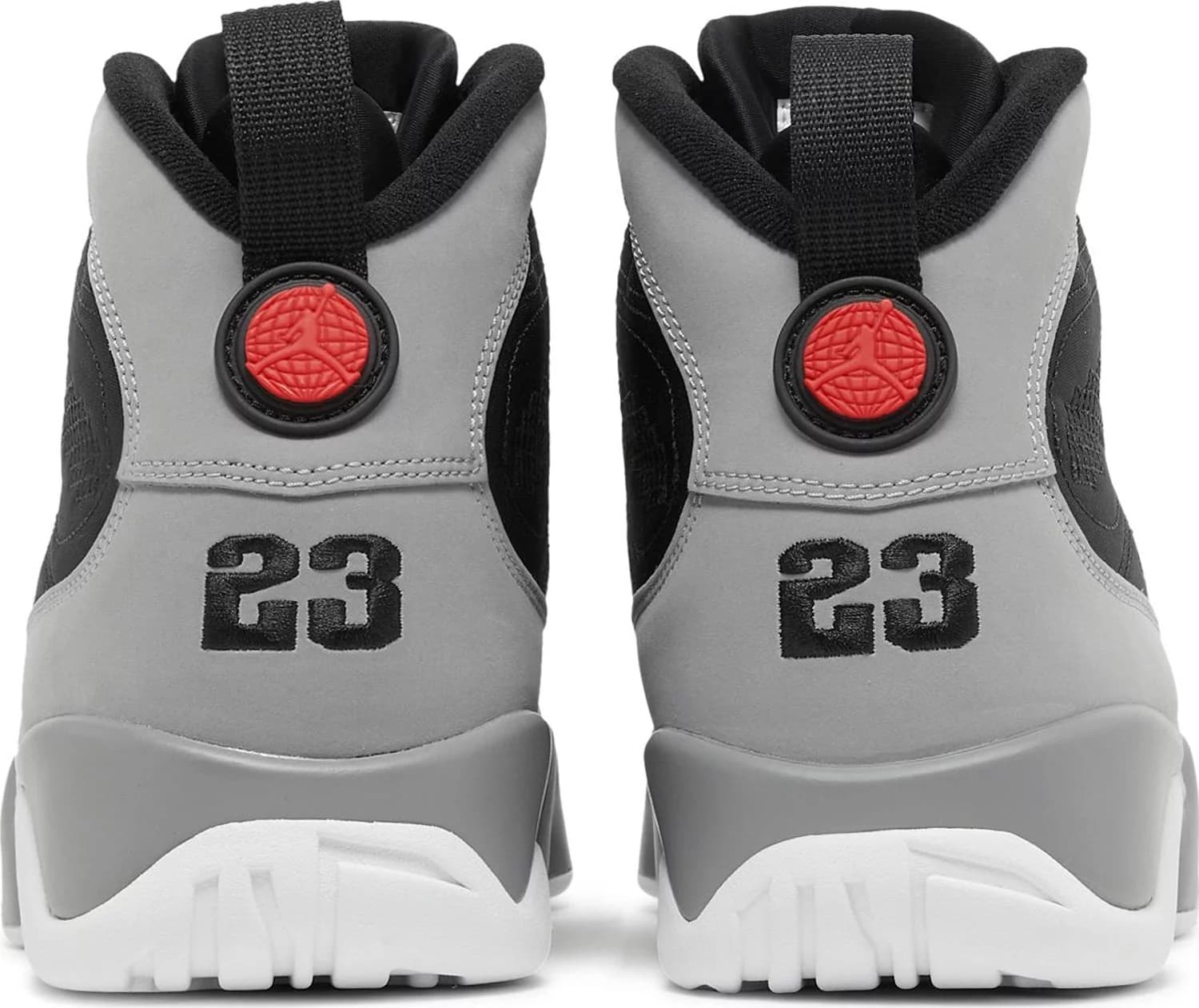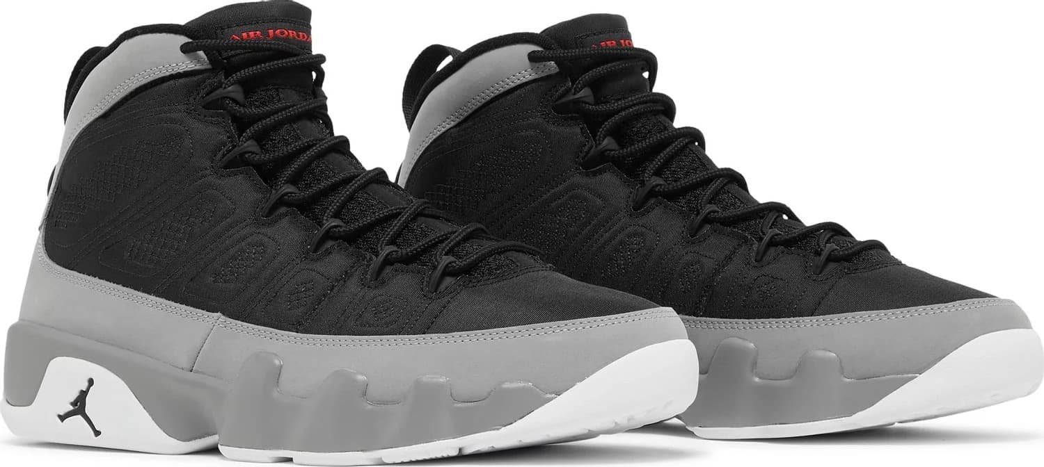 Air Jordan 9 Retro 'Particle Grey' - это нейтральная расцветка модели 90-х годов, которая изначально была выпущена во время первого ухода MJ из баскетбола. Ретро-силуэт обновлен дышащим текстильным верхом черного цвета, закрепленным скоростными шнурками и украшенным тональными деталями строчек. Брызговик из нубука нейтрального серого цвета огибает пятку и поднимается к среднему воротнику. Контрастные малиновые цвета украшают элементы брендинга кроссовок, включая язычок Air Jordan и литую эмблему Jumpman на пятке. Легкая амортизация обеспечивается матово-серой полиуретановой промежуточной подошвой с вложенными в нее блоками Air-sole в передней части и пятке.- Цвет: Black/University Red/Particle Grey/White