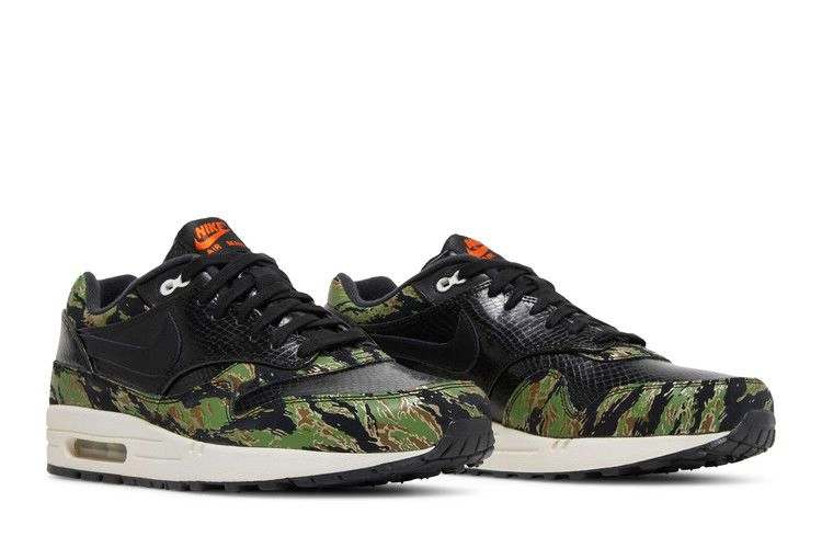 Токийский магазин Atmos придает Air Max 1 вид дикой природы, выпуская эту модель в феврале 2013 года. Дизайн включает в себя зеленый тигровый камуфляж на брызговиках и воротнике в сочетании с черной кожей со змеиным тиснением на мыске, четверти и пятке. Контрастные вкрапления оранжевого оттенка появляются на язычке Nike Air и вышивке на пятке, а промежуточная подошва компенсирует сложную композицию чистым белым цветом.