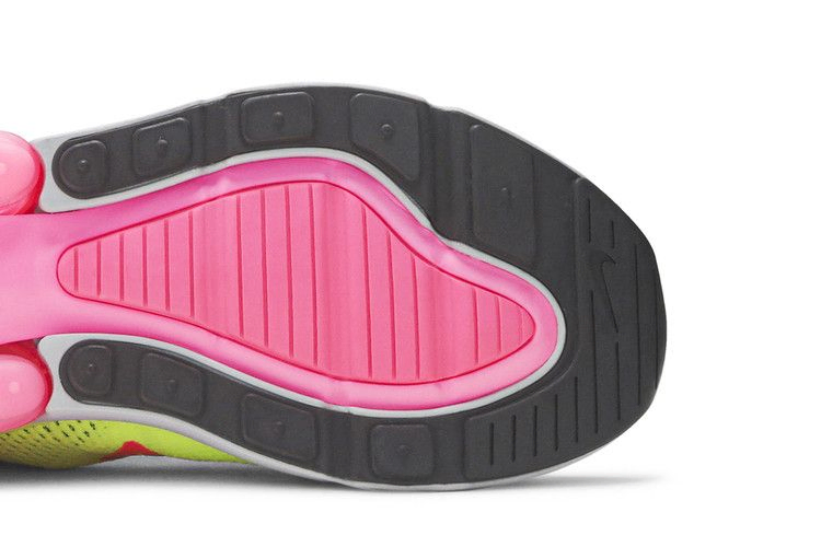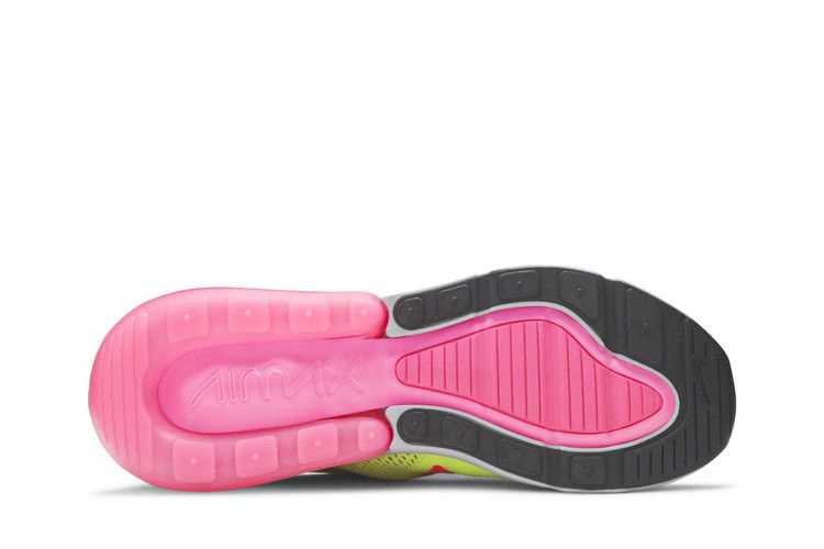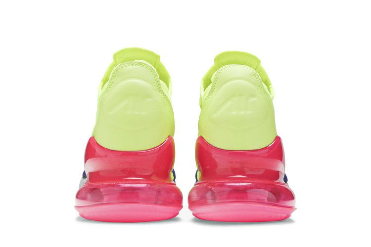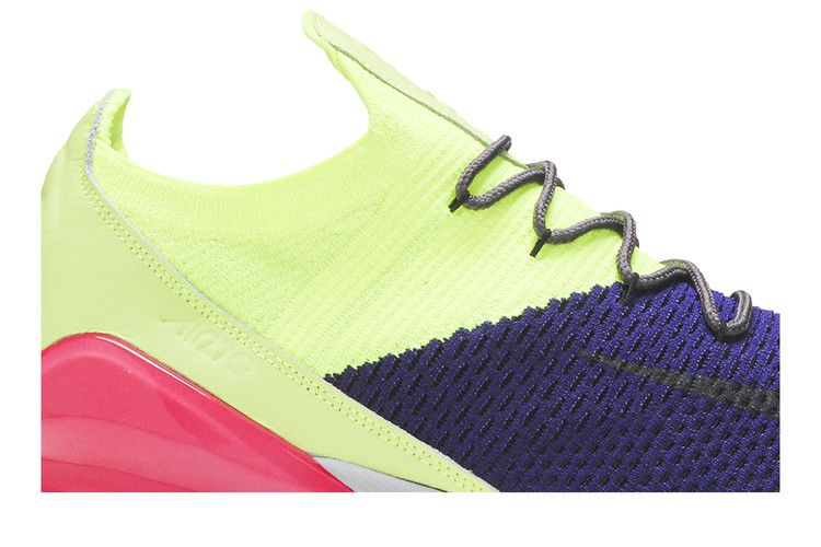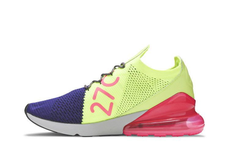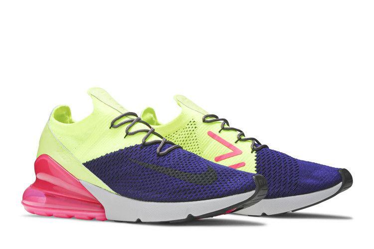 На момент выхода Nike Air Max 270 были известны как кроссовки с самым высоким показателем Air Max по состоянию на 2018 год. Кроссовки Nike Air Max 270 Flyknit 'Multi-Color' получили громкое неоновое обновление. Эти кроссовки выполнены из лаймово-зеленого и фиолетового материала Flyknit, имеют завышенный язычок, изогнутую форму шнурков и полупрозрачный ярко-розовый воздушный блок в пятке для дополнительного комфорта и стиля. Сдержанная деталь Swoosh на носке завершает образ.