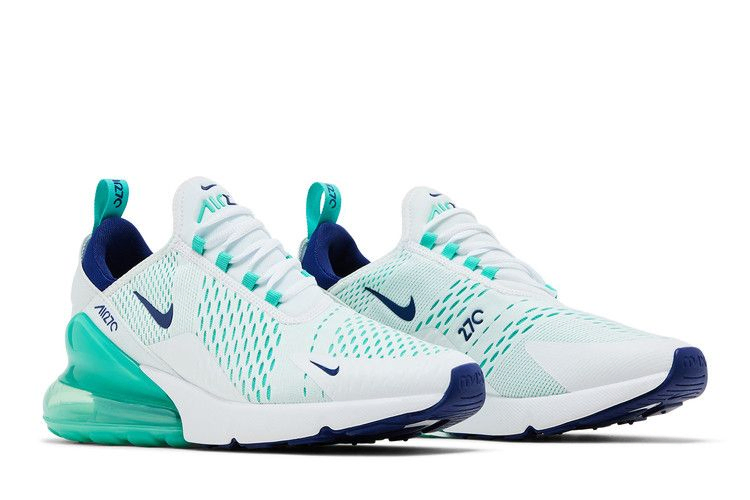 Нестареющая спортивная обувь, созданная для бега вне трассы, Air Max 270 отличается балансом цвета и технологий в этой версии Hyper Jade. Эта версия, представленная в феврале 2019 года, имеет весеннюю палитру из белого, гипернефритового и глубокого королевского синего цветов и сочетает в себе современный комфорт с большим объемом воздушной подушки 270 Max Air.