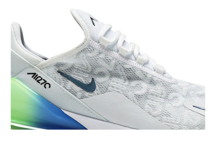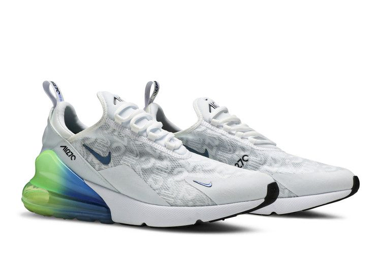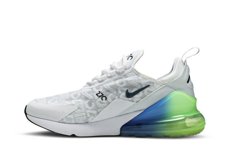 Вдохновленная несколькими кроссовками Nike 1990-х годов, модель Nike Air Max 270 SE получила свое название за 270-градусный видимый блок Air Max, расположенный в пятке. Модель 2019 Nike Air Max 270 SE "Explosion Green" добавляет к этому брендингу еще и графику "Air Max 270", тисненную по всему преимущественно белому верху. Блок Air Max выделяется смелым сине-зеленым градиентом, который более тонко повторяется на паре маленьких Swooshes, расположенных на боковой панели и передней части стопы.