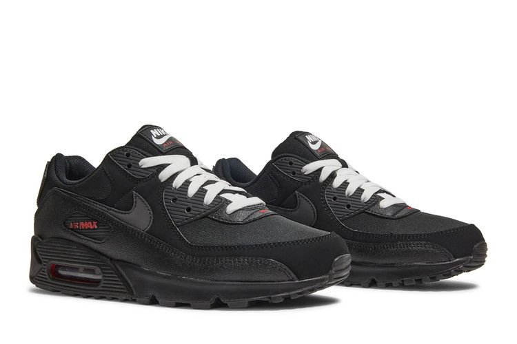 Ретро-кроссовки Nike Air Max 90 "Bred" выполнены в актуальной цветовой палитре. Белые шнурки фиксируют верх из смешанных материалов, состоящий из черной текстильной основы рипстоп с тональными накладками из нубука и брызговиком из искусственной кожи. Контрастные малиновые акценты присутствуют на элементах брендинга кроссовок, включая фирменное окошко логотипа Air Max и вышитый мини-Swoosh на носочной части. Легкая амортизация обеспечивается сплошной черной подошвой из пеноматериала, дополненной красным блоком Max Air под пяткой.