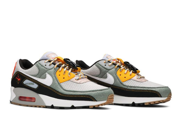 Модель Nike Air Max 90 "Fresh Perspective" придает ретро-бегунам утилитарный вид. Верхняя часть сочетает в себе серый тканый текстиль и кожаные накладки цвета шалфея, испещренные вихревыми линиями, напоминающими топографическую карту. Контрастные цветовые акценты привносят оранжевая прорезиненная пятка и желтые TPU люверсы. Эти же оттенки повторяются на графике компаса, выбитом на черном нубуковом брызговике. В знак уважения к снаряжению для активного отдыха кроссовки оснащены холщовым язычком и веревочными шнурками в походном стиле, которые дополнены ремешком с пряжкой. Легкая амортизация обеспечивается полиуретановой подошвой и оранжевым блоком Max Air под пяткой.