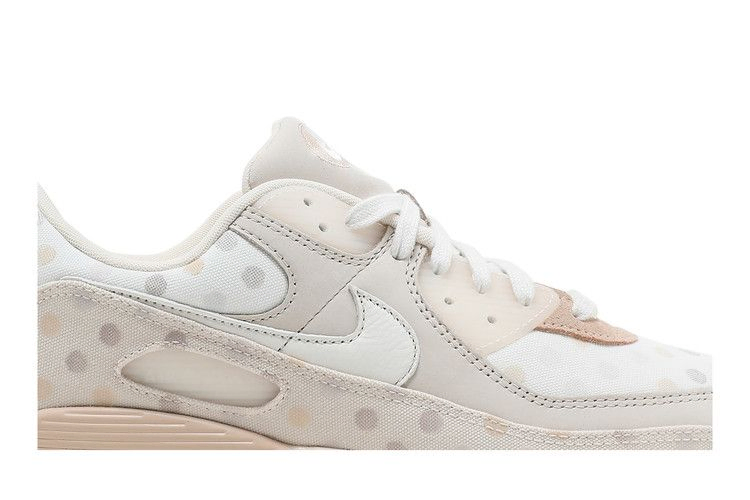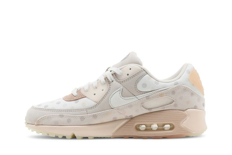 Nike Air Max 90 NRG "Shimmer Polka" обновляет винтажные кроссовки, добавляя в них новые детали и премиальную сборку. Тонкий принт в горошек нанесен на холщовую ткань, используемую на носочной части, воротнике и брызговике. Остальная часть верха покрыта светло-коричневой кожей, полупрозрачными акцентами из TPU и свайпом из кожи. На язычке с мягкой подкладкой расположен брендинг Nike Air с вышитым графиком диаграммы Венна. Кроссовки установлены на полиуретановую промежуточную подошву персикового цвета с видимой амортизацией Max Air под пяткой.
