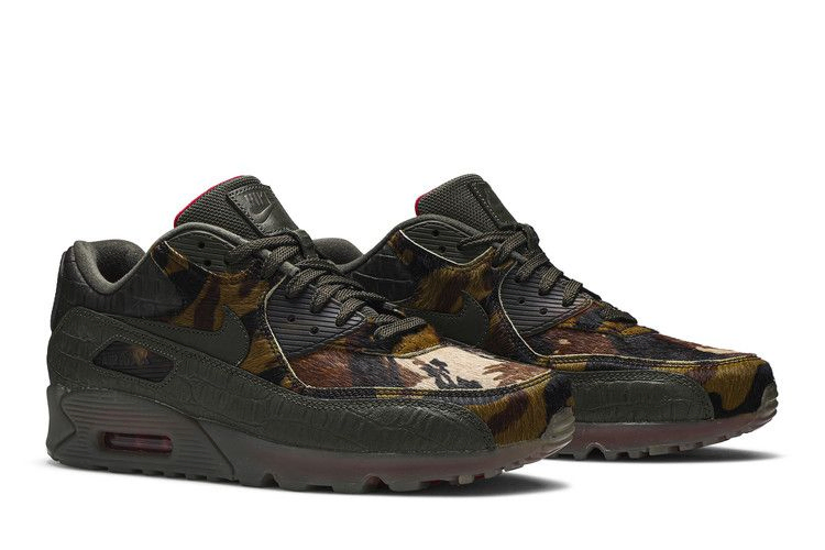 Кроссовки Nike Air Max 90 претерпели множество трансформаций со времен первоначального образца Тинкера Хэтфилда, находя вдохновение в музыке, культуре и искусстве. Эта модель, выпущенная в ноябре 2019 года, представляет собой экзотическую модель из крокодиловой кожи с тиснением и камуфляжной шерсти пони. Полупрозрачный TPU обновляет люверсы и логотипы на четвертных панелях. Полупрозрачная резина покрывает промежуточную подошву Max Air и вафельную подошву.