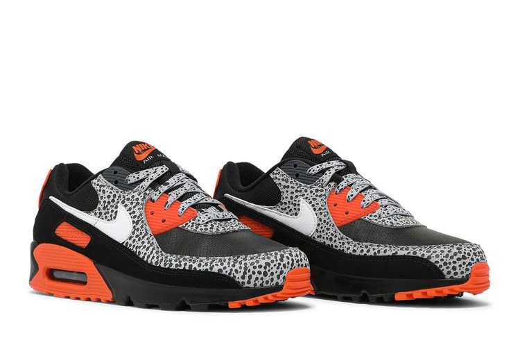 Nike Air Max 90 "Safari" заимствует культовый мотив дизайна, который впервые появился на Nike Air Safari 1987 года - как и AM90, кроссовки, появившиеся благодаря легенде дизайна Nike Тинкеру Хэтфилду. Здесь принт Safari использован на кожаных накладках и плетеных шнурках, а остальная часть верха сочетает в себе перфорированную черную кожу с акцентами из TPU цвета Safety Orange. Подходящий клин промежуточной подошвы окружает фирменный блок Max Air под пяткой.