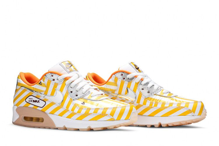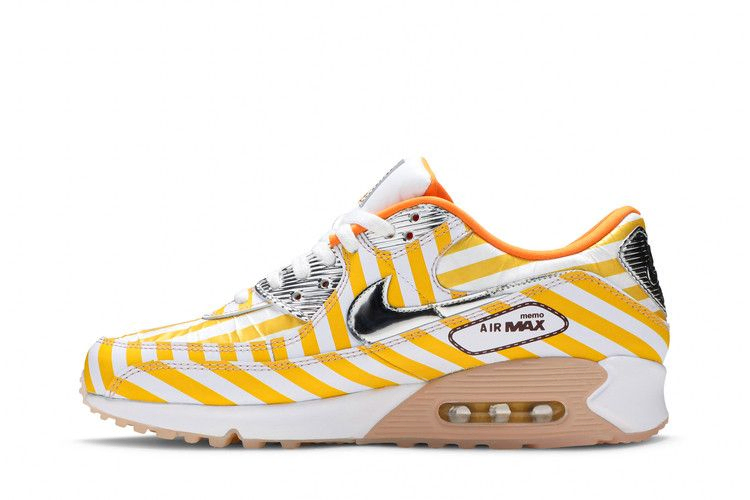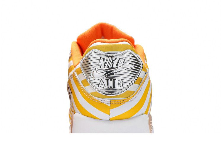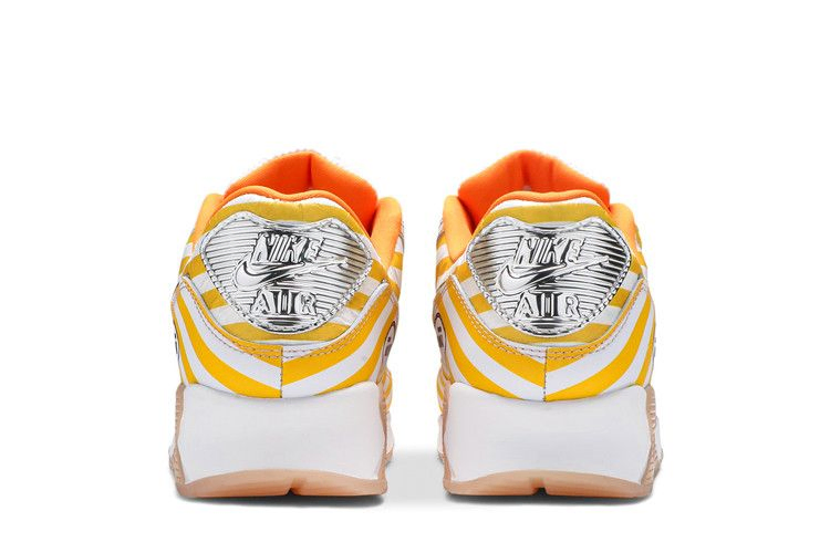 Модель Nike Air Max 90 SE "Swoosh Mart Fried Chicken" вдохновлена характерной упаковкой жареных цыплят, используемой в японских магазинах, таких как Family Mart. Ретро-бегунок украшен желтыми и белыми полосами по всему верху, включая отрывной внешний слой на носочной части и воротнике. На этих участках видны оранжевые замшевые панели с различными элементами брендинга, включая "Hot Air" и "AM90", выполненные мультяшным шрифтом. Хромированные детали украшают литые люверсы, пришитую пяточную нашивку и обрезанный Swoosh, а на графическом носке изображена пара металлических щипцов.
