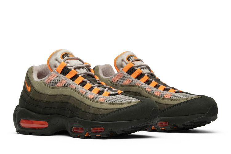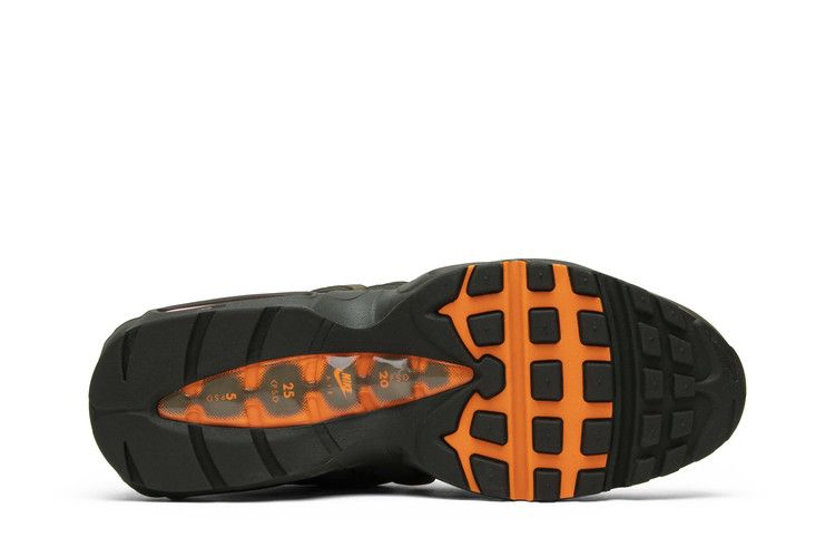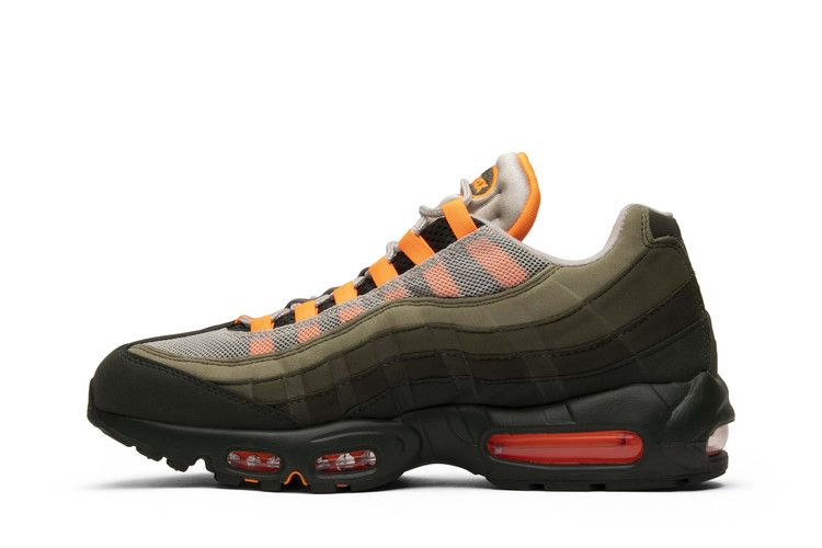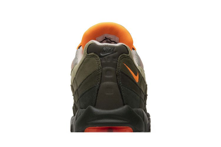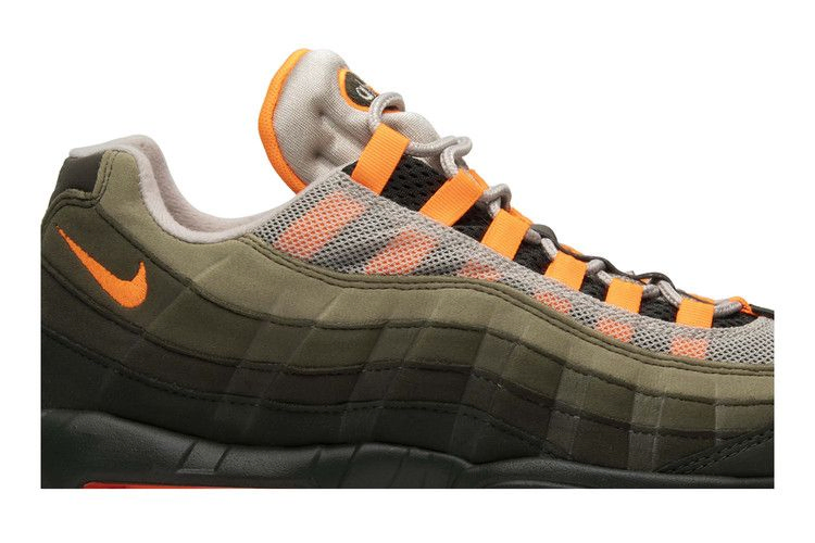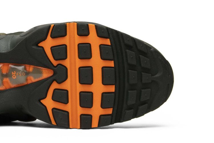 Модель Air Max 95 выполнена в нейтральном, армейском стиле и имеет оливковые и оранжевые оттенки сетки и кожи, напоминающие палитру военной летной куртки. Несколько амортизирующих подушечек Air Max расположены на промежуточной подошве для защиты от сильных ударов, а гибкие канавки на подошве имеют вафельный рисунок для улучшения сцепления с поверхностью, что свидетельствует о дизайнерском наследии бренда.