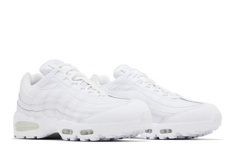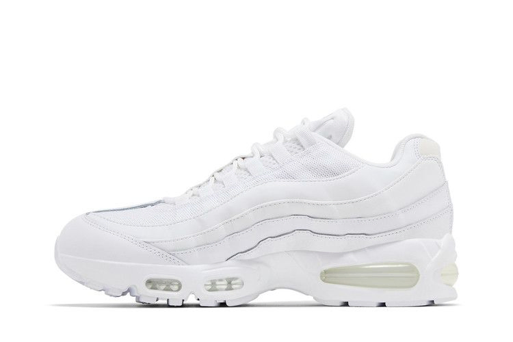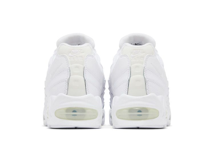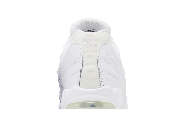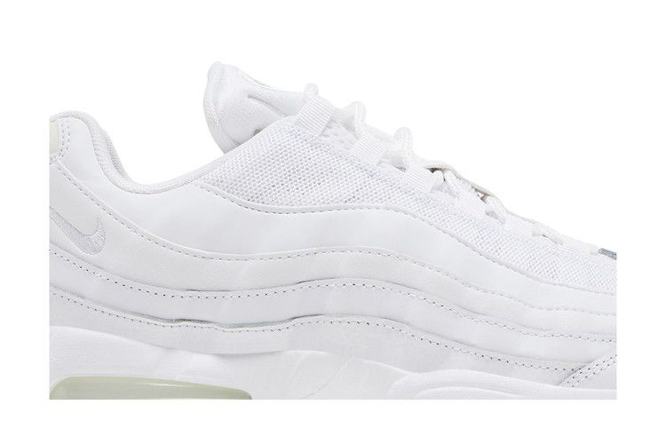 Модель Nike Air Max 95 OG "White Pure Platinum" имеет белый кожаный верх с волнистыми боковыми панелями и закреплена веревочными шнурками, продетыми через люверсы. Светоотражающие детали расположены на язычке и литой панели пятки с брендингом Nike Air. Кроссовки дополнены белой полиуретановой подошвой с видимой амортизацией Air в носочной и пяточной частях.