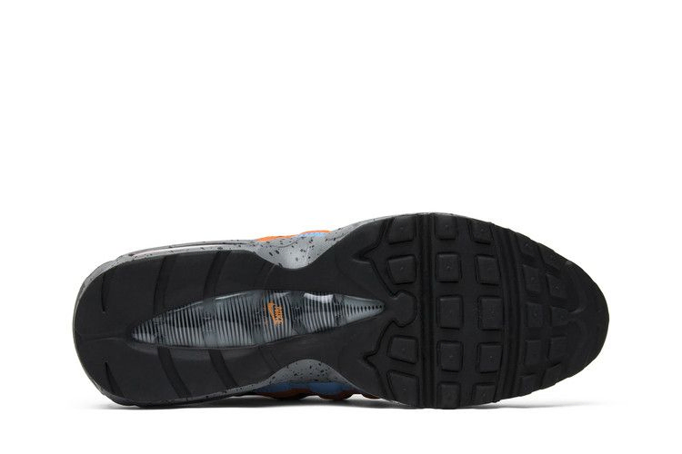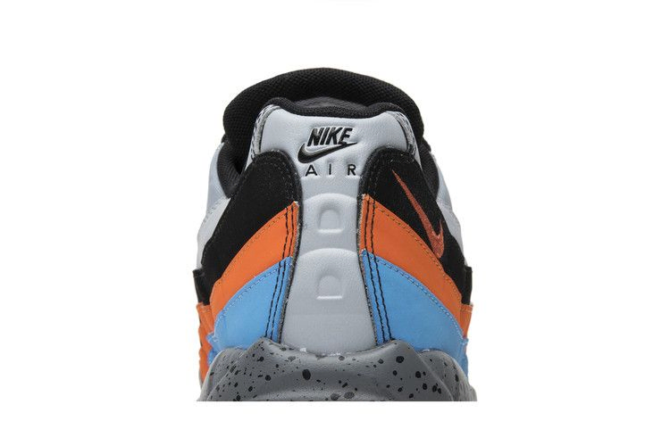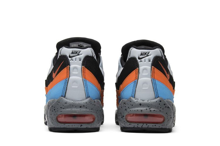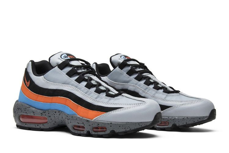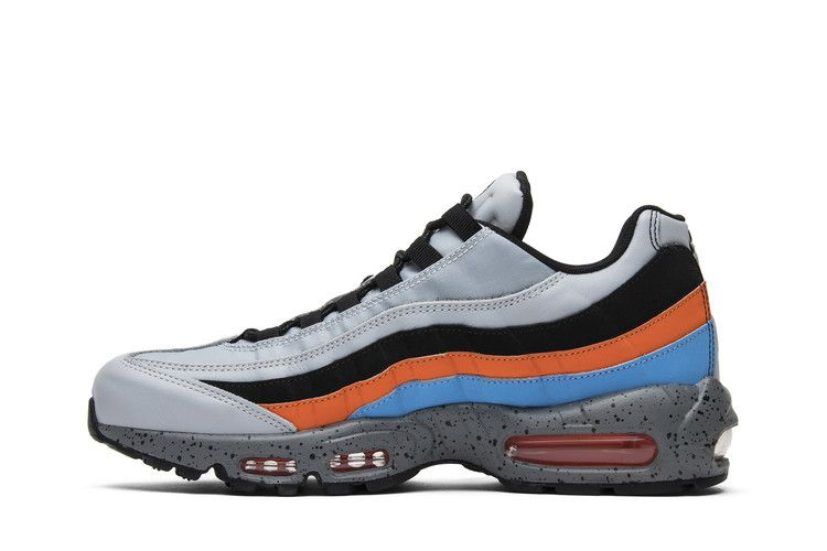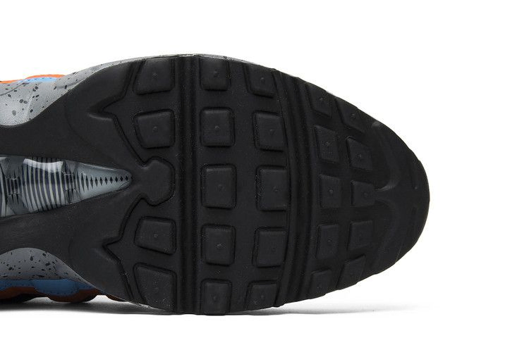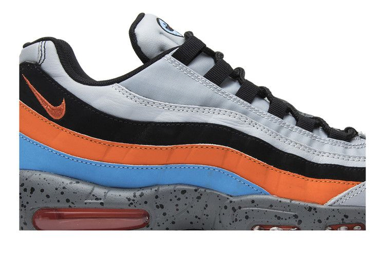 Модель Air Max 95 выполнена из серой кожи с ярким сочетанием оранжевого, синего и черного цветов на ребристых боковых панелях. Серая промежуточная подошва с крапинками содержит видимые амортизаторы Air в носочной и пяточной частях, окрашенные в безопасный оранжевый цвет.