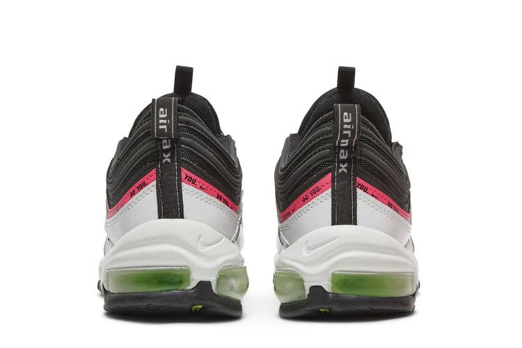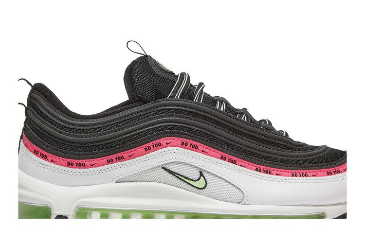 Nike Air Max 97 'Do You' демонстрируют пастельные акценты и сокращенную версию культового слогана бренда. Верхняя часть кроссовок выполнена из черной сетки с тональными накладками в виде капель воды с отражающим покрытием 3M. Полоска розовой кожи с повторяющейся фразой "Do You" переходит в брызговик из белой кожи. Неоново-зеленые мини-Swooshes украшают четверть панели и язычок. Яркий оттенок повторяется на видимом блоке Max Air, который проходит по всей длине черной подошвы из вафельной резины.