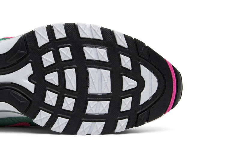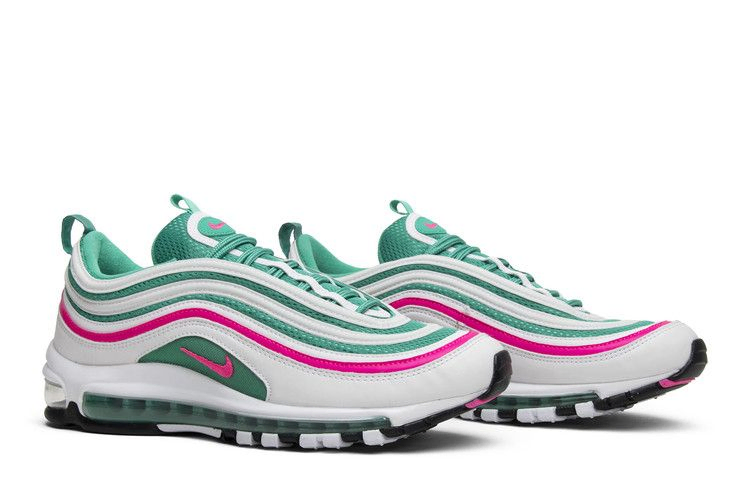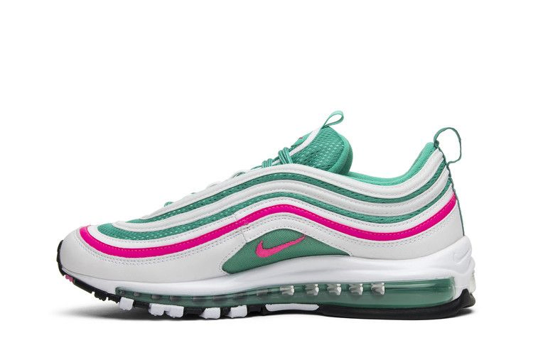 Nike Air Max 97 "South Beach" заслужили свое неофициальное название благодаря сочетанию ярких тропических цветов. Ретро-кроссовки имеют классическую конструкцию из сетки и кожи, отделанную в сочетании ярких оттенков, напоминающих об архитектуре арт-деко юго-восточной Флориды. Фирменные волнистые накладки 97-го в белом и розовом цветах обернуты вокруг сетчатой основы Kinetic Green, которая поддерживается подошвой Air по всей длине для легкой амортизации.