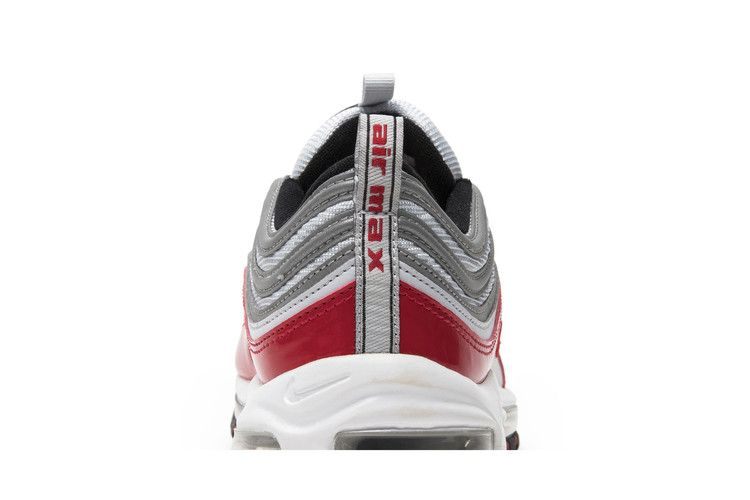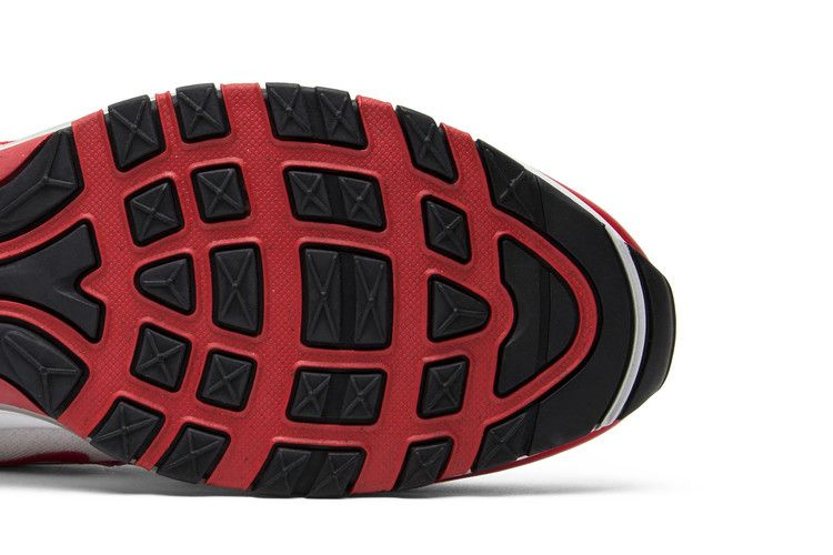 Хотя кроссовки Nike Air Max 97 уже давно стали классикой, эта модель Nike Air Max 97 "University Red" позаимствовала расцветку у другой классической модели - Nike Air Max 1. На верхней части фирменные "волны" AM 97 серебристого цвета, которые светятся в темноте благодаря светоотражающему материалу 3M, поверх лакированной красной накладки и белой промежуточной подошвы. Амортизационный блок по всей длине сочетается с черно-красно-белой подошвой.