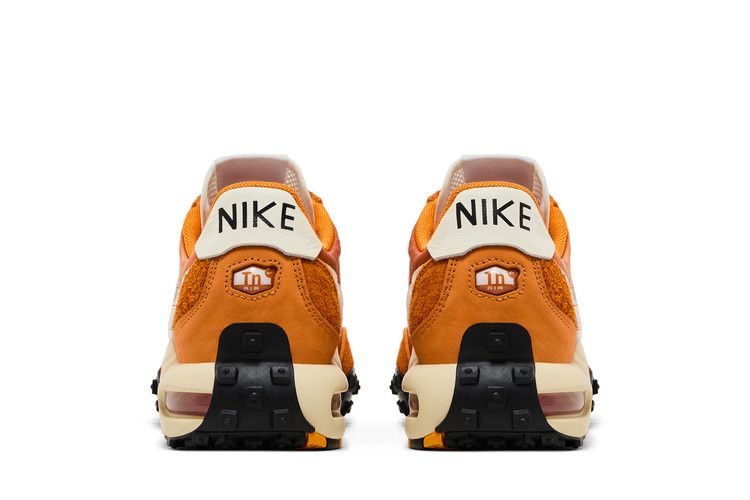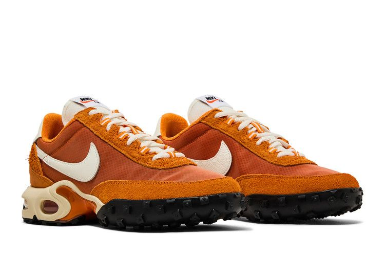 Nike Air Max Waffle "Bright Ceramic" - гибридный силуэт, позаимствовавший верхнюю часть у классических вафельных кроссовок. Темно-оранжевый нейлоновый верх с тональными накладками из ворсистой замши на носочной и пяточной частях. Белые кожаные детали расположены на фирменном логотипе Swoosh и заднике с логотипом Nike. Гладкая замшевая панель пятки со значком Tn Air и легкая полиуретановая промежуточная подошва цвета кокосового молока с заметной пластиной из TPU на хвостовике и видимой амортизацией подошвы Air позаимствованы у Air Max Plus.