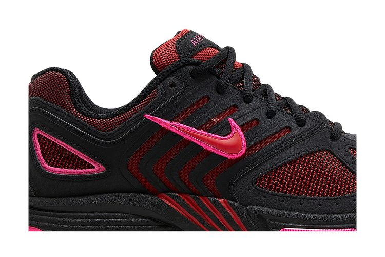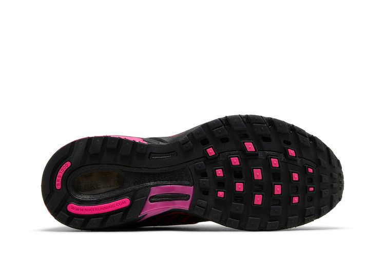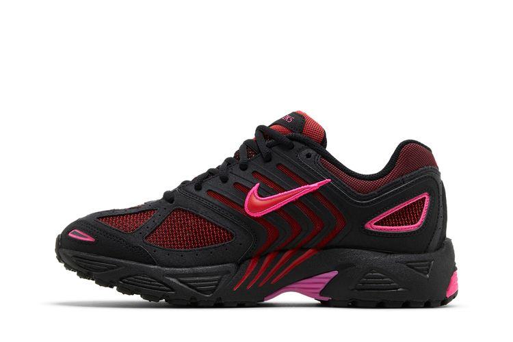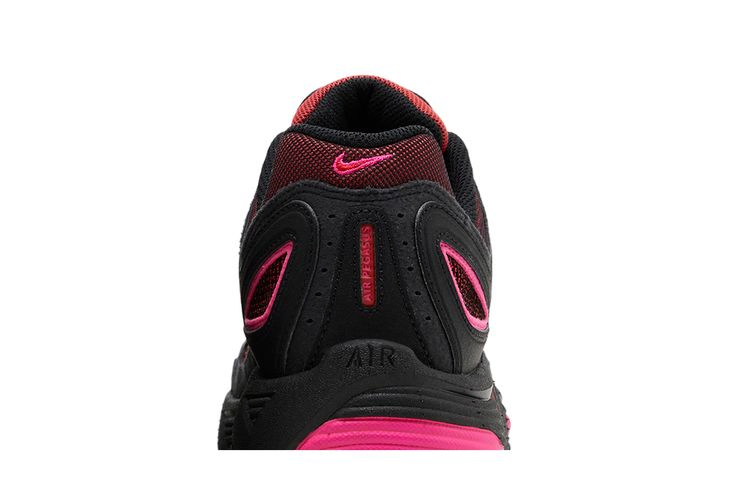 Кроссовки Nike Air Pegasus 2K5 "Black Fire Red" выполнены из малиновой сетки с накладками из черной искусственной кожи. Вышивка горячего розового цвета и алый амулет Swoosh украшают задник. Амортизация Nike Air по всей длине размещена в черной подошве из пеноматериала, украшенной контрастными красными и розовыми цветами. Вафельная резиновая подошва Nike обеспечивает надежное сцепление с поверхностью.