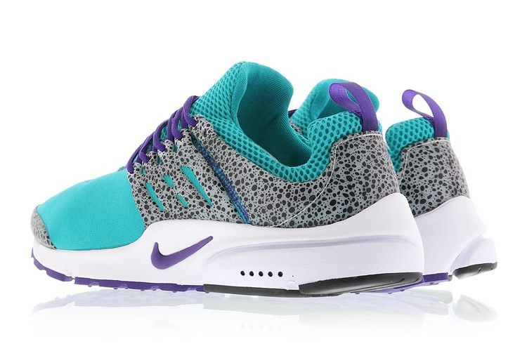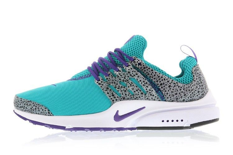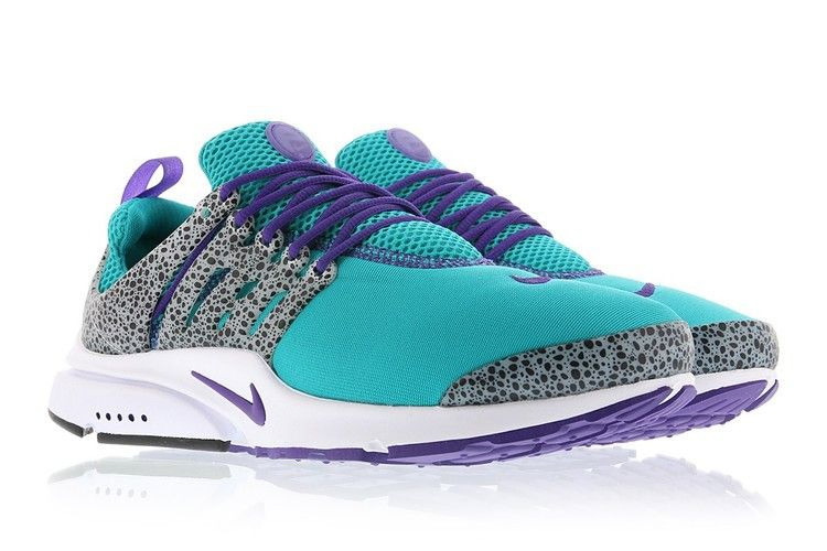Созданные Тоби Хэтфилдом, Nike Air Presto отказываются от стандартного дизайна обуви, а их конструкция создана для того, чтобы облегать их как футболку. В этой модели "Teal Safari", выпущенной в мае 2017 года, ретро-графика 1987 года изображена на деталях из TPU, поддерживающих ботинок из трикотажа и сетки. Контрастные товарные знаки подчеркивают спортивное наследие. Air-Sole и гибкая резиновая подошва, отмеченные знаком в виде пяти точек, добавляют классический штрих.