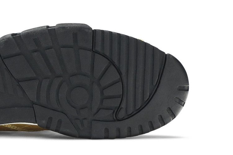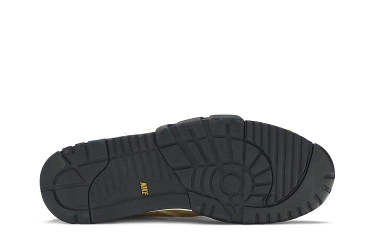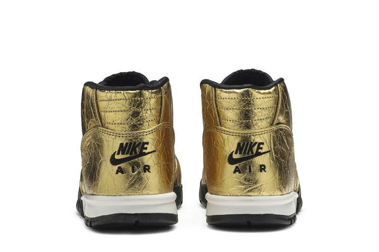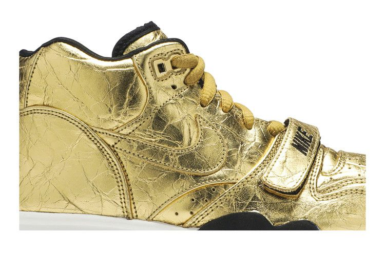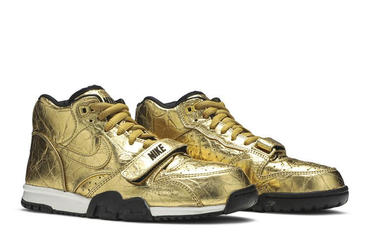 В честь Суперкубка 50 Nike окрасил силуэт Air Trainer 1 в яркий золотистый металлик по всему верху, украсив его фактурой из потрескавшейся фольги. Контрастом к блестящему внешнему виду служит белая межподошва и черные акценты на носках, подошве и брендинге.