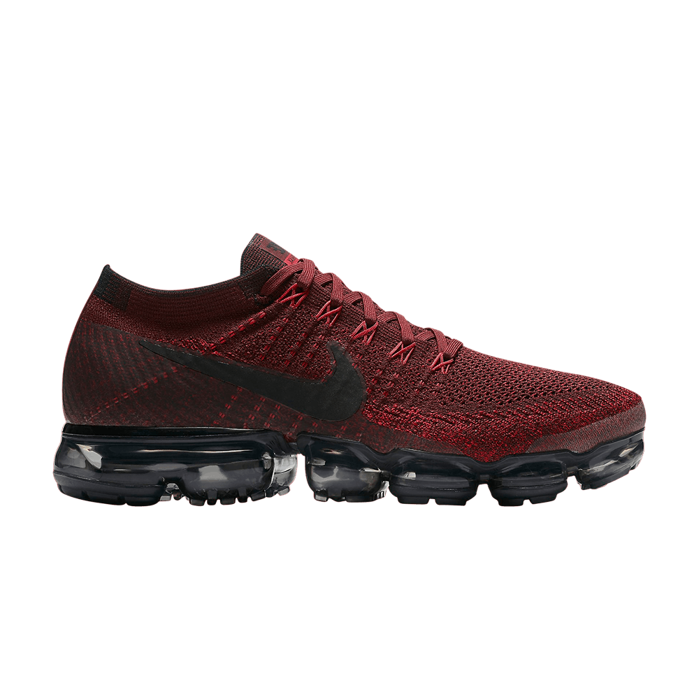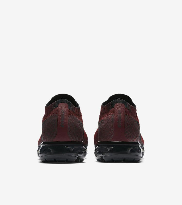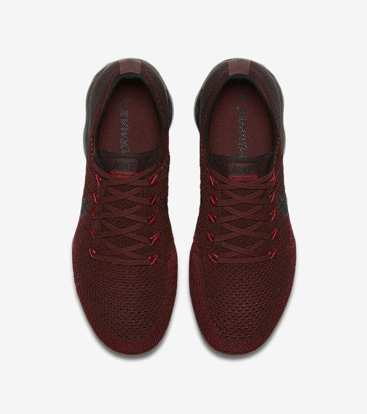 Nike Air VaporMax "Dark Team Red" имеют красно-бордовый верх из флайкнита с тональными кабелями Flywire. Дизайн, выпущенный в июле 2017 года, также включает в себя черный свуш и черный блок Air VaporMax.