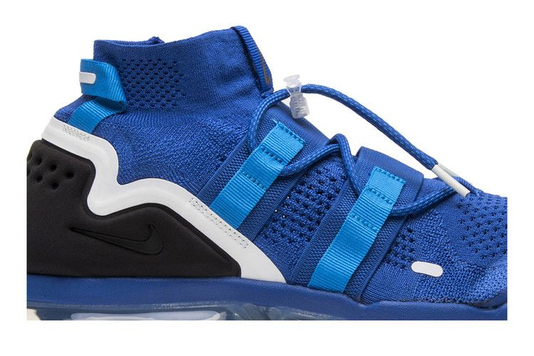 Кроссовки Nike Air VaporMax Flyknit Utility органично сочетают в себе спортивную эстетику и прочные утилитарные элементы. Выпущенные в апреле 2018 года, они выполнены в синем цвете Game Royal, подчеркнутом черными и белыми акцентами. Верхняя часть, созданная из облегающего стопу материала Flyknit и обмотанных кабелей Flywire, усилена воротником средней посадки и застежкой-шнурком. Основание оснащено фирменным блоком VaporMax.