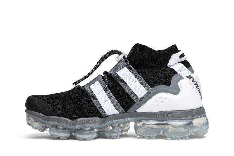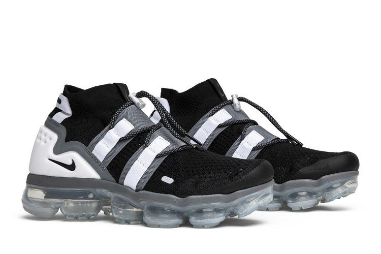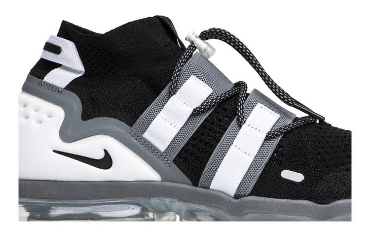 Nike добавляет амортизацию и стабильность к дизайну Air VaporMax в модели VaporMax Flyknit Utility. Кроссовки сохранили полноразмерный амортизационный блок VaporMax, но при этом изменили черно-белый верх с эластичными ремнями и системой застежек. Пятка поддерживается накладкой, а пятка и боковые стороны украшены отраженными деталями.
