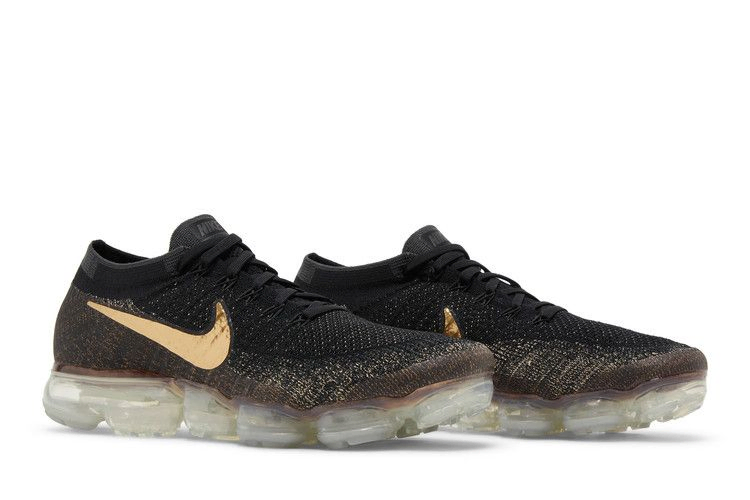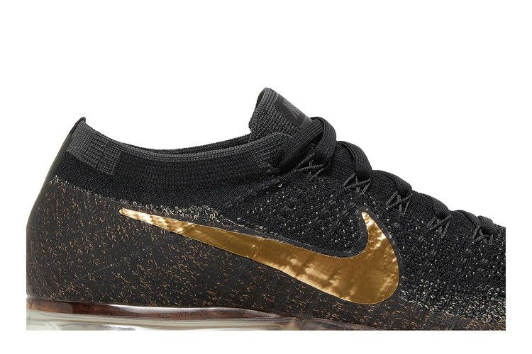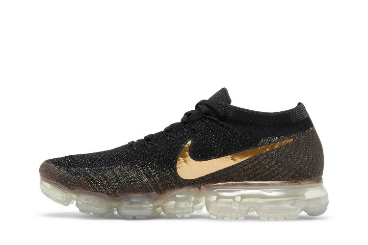 Модель Nike Air VaporMax была выпущена в 2016 году и положила начало высокоскоростным беговым технологиям Nike. В этой новой расцветке золотой металлический Swoosh выделяется на боковых панелях черного верха. Верх кроссовка выполнен из материала Flyknit и оснащен динамическими тросами Flywire для поддержки, а амортизацию под ногами обеспечивает прозрачный блок VaporMax, расположенный по всей длине кроссовка.