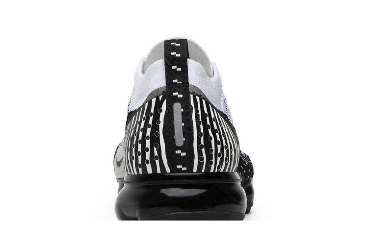 Nike Air VaporMax 2 "Zebra" демонстрирует характерный принт дикой природы на бесшовной накладке пятки кроссовка, обеспечивая дополнительную структуру, которая усиливает облегающие ноги свойства верха Flyknit. Черно-белая отделка дополнена сплошной черной платформой VaporMax, исключающей необходимость в пенопластовой прослойке и позволяющей стопе напрямую пользоваться технологией Nike Air.