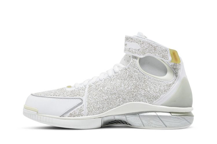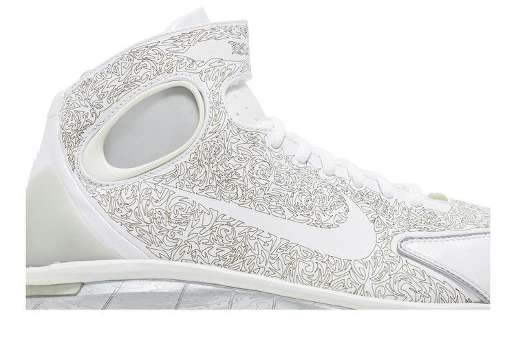 Кроссовки Nike Air Zoom Huarache 2K4 KB 'Kobe Laser' демонстрируют футуристический дизайн в белом и серебристом цветах. Отдавая дань уважения суперзвезде НБА, благодаря которой модель Air Zoom Huarache 2K4 завоевала популярность, Kobe Laser имеют верхнюю часть с абстрактным принтом и фирменным внутренним рукавом Huarache. Эстетически баскетбольные кроссовки дополнены металлическими акцентами на пятке и носке.
