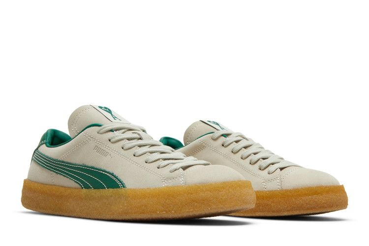 Модель AMI x PUMA Suede Crepe 'Pristine' переосмысливает икону кроссовок с обновленной конструкцией. Парижский модный бренд обновил модель с подошвой из натурального крепа, заменив ею традиционную резиновую подошву оригинала. Верхняя часть кроссовок выполнена из замши цвета загара с усиленным мыском и зеленой кожаной полосой Formstrip. Зеленая кожа используется для отделки пятки, на которой красуются несовпадающие логотипы AMI и PUMA. Оба логотипа повторяются на больших тканых язычках.