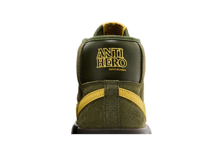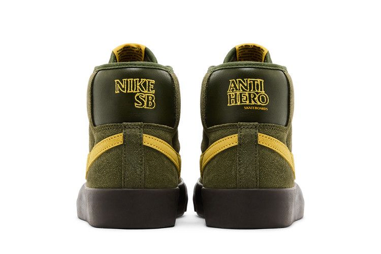 Модель Antihero x Nike Zoom Blazer Mid QS SB 'Rough Green' придает ретро-силуэту более современный вид. Текстурированная замша нейтрального оливково-зеленого оттенка использована для верха, отделанного тональными деталями из холста и украшенного желтым замшевым логотипом Swoosh в стиле ретро. Зеленые кожаные задники с логотипами Nike SB и Antihero на левом и правом ботинках, а на тканом язычке красуется брендинг Nike SB и Grant Taylor. Кроссовки поддерживаются вулканизированной резиновой подошвой, усиленным бампером на носке.