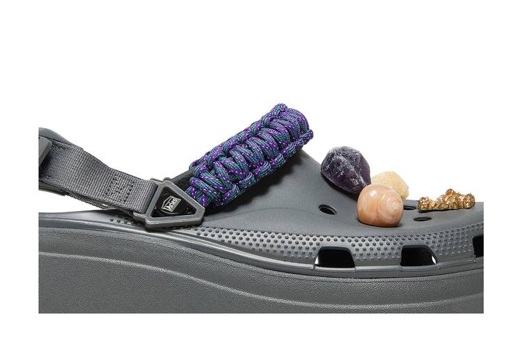 Модель сабо Aries x Crocs Classic Hiker Xscape Clog 'Slate Grey', созданная в рамках коллекции обуви лондонского бренда одежды, придает стильный вид прочным слипонам. Серый верх из вспененного материала Croslite оснащен поворотным пяточным ремнем, а также фиолетовым ремешком из паракорда со светоотражающими деталями. Пользовательские брелоки Jibbitz напоминают о найденных сокровищах пляжного отдыха, включая кристаллы аметиста и цитрина, ракушки и натуральные камни янтаря. Подошва на платформе, поддерживаемая подошвой с зубчатой подошвой для сцепления с бездорожьем, окрашена в серый цвет.- Артикул: 208683-0DA