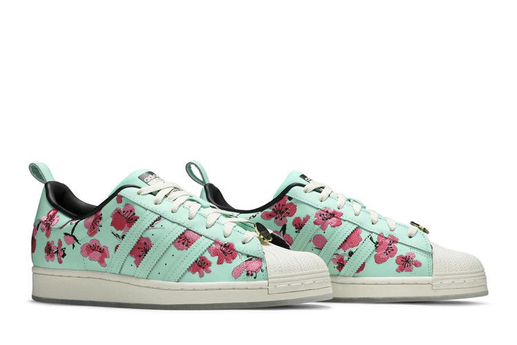 Модель Arizona x adidas Superstar "Green Tea With Ginseng and Honey" вдохновлена характерной упаковкой чая Arizona Iced Tea. Классический низкий топ выполнен из ярко-зеленой кожи, украшенной розовыми цветами вишни и брендингом Arizona на язычке пятки. Золотисто-металлические кружевные украшения изображают смайлик с фразой "Have an Iced Day". Эта фраза повторяется на полупрозрачной подошве левого ботинка, а на правой - логотип Arizona.