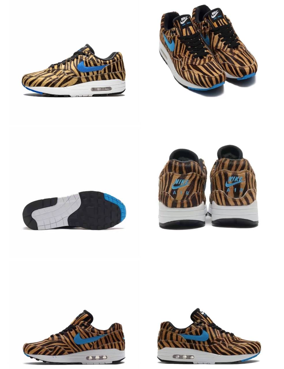 Nike и японский розничный магазин atmos выпустили пакет Air Max 1 DLX Animal 3.0 в июле 2019 года онлайн и на выставке ComplexCon в Чикаго в конце того же месяца. В коллекцию входят кроссовки Nike Air Max 1 DLX Tiger с многослойными накладками, покрытыми шерстью пони с принтом тигра. Яркие контрастные свуши подчеркивают среднюю часть стопы вместе с дополнительными синими деталями на язычке и подошве. Ниже эта модель сохраняет фирменные видимые детали Max Air 1987 OG и резиновую подошву.- Цвет: Multi/Color/Blue Hero/White