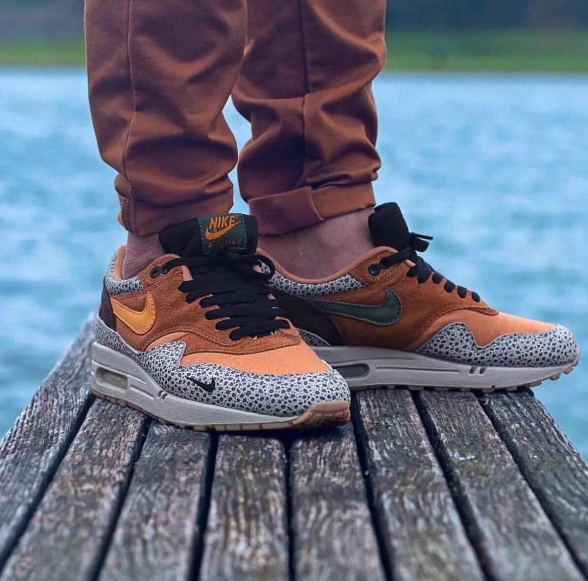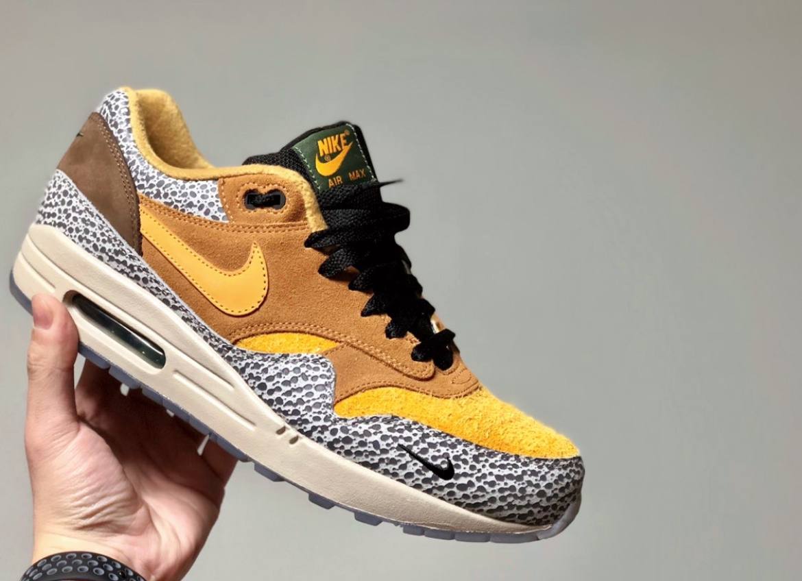 Atmos x Nike Air Max 1 Safari 2016 - это переиздание классической коллаборации 2002 года с японским брендом Atmos в 2016 году. В переиздании используется та же цветовая схема, что и в оригинале, но вместо холщовой накладки на мыске и резиновой подошвы 2002 года используются замшевый носок и голубая полупрозрачная подошва.