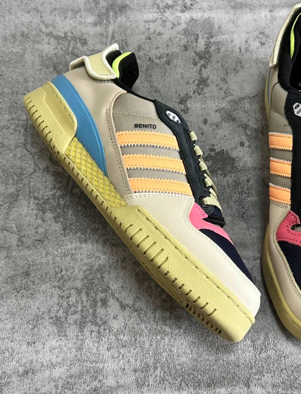 Силуэт Bad Bunny x adidas Forum Powerphase 'Catch and Throw' демонстрирует гибридный дизайн с набивкой и пропорциями, вдохновленными скейт-обувью начала 2000-х годов. Верхняя часть adidas Forum выполнена в смешанной палитре, которая отсылает к игре Catch and Throw, которой латиноамериканский артист увлекался в детстве, с темой самовыражения без ограничений. Шнуровка Ghillie фиксирует верх из холста и кожи, выполненный в нейтральных оттенках загара и черного с пастельными вкраплениями. Элементы брендинга включают графику "третьего глаза" Bad Bunny на съемном язычке, логотип Trefoil на липучке на пятке и имя художника - Бенито - напечатанное на четвертной панели. Кроссовки опираются на промежуточную подошву, позаимствованную у adidas Powerphase, с деталями из паутины Dellinger для придания винтажности.- Цвета: Sand/Acid Orange/Halo Gold
