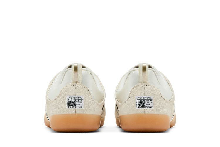 Обувь Bad Bunny x adidas Ballerina 'Off White Black Gum' - обтекаемый силуэт, созданный на основе adidas Taekwondo. Верх выполнен из нейлона цвета слоновой кости с тональными замшевыми накладками и черными кожаными полосками. Система шнуровки с утягивающим шнурком сочетается с завязкой на пятке для удобства надевания и снятия. Язычок украшен контрастной строчкой, а на задней части пятки красуется ярлык с указанием размера, напоминающий о Gazelle Indoor от Bad Bunny. Брендинг 'Benito' украшает боковую сторону. Подошва кроссовок выполнена из полупрозрачной резины.- Артикул: JQ9229