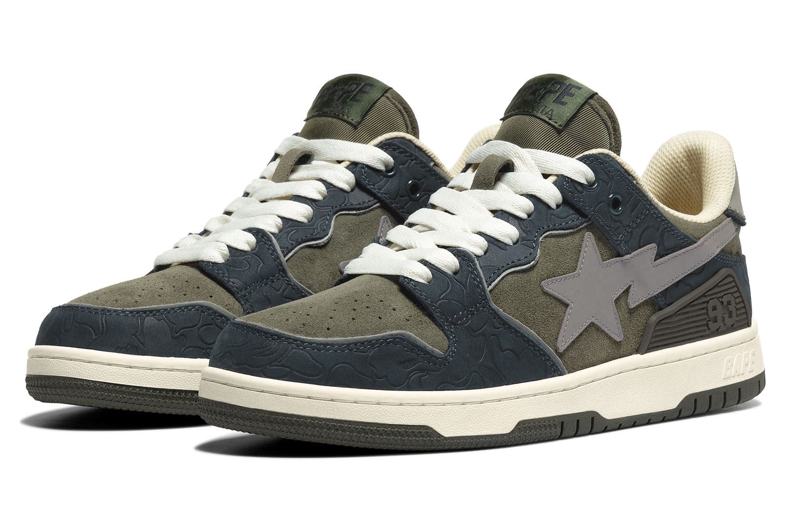 Отличительными элементами модели BAPE Sk8 Sta Army Green Dark Blue являются фирменный логотип бренда в виде звезды на боковых сторонах и литой пяточный каблук с цифрой 93, обозначающей год основания Bape. Набор кроссовок был представлен тремя вариантами Sk8 Sta Low, включая серо-фиолетовый, черно-желтый и зеленый с красным и фиолетовым. Что касается модели High, то она представлена в простой бело-черной цветовой схеме, а также парусной парой с оранжевыми и красными акцентами.- Модель: Кроссовки BAPE Sk8 Sta